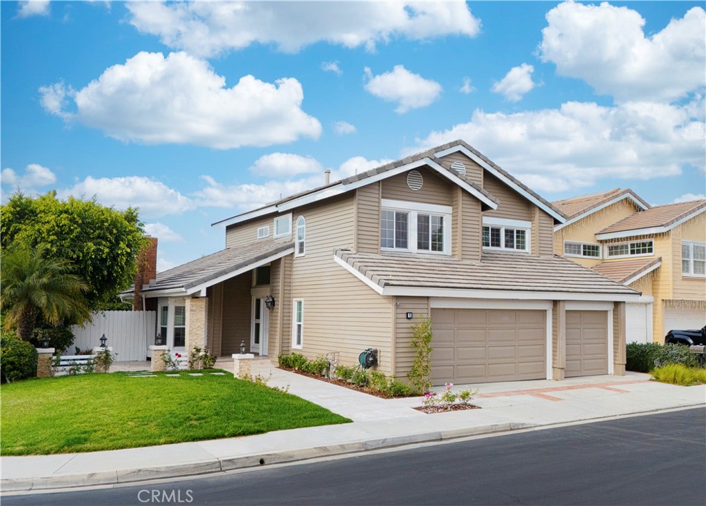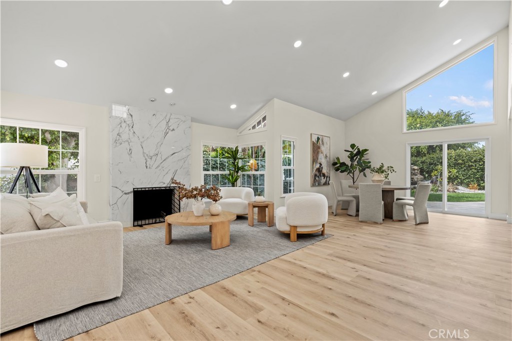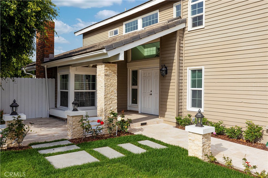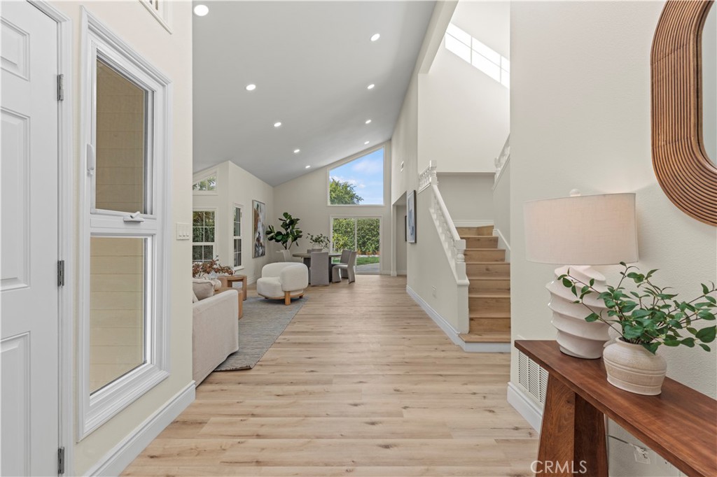 Welcome to the stunning 1 Descanso, nestled in a gated community! Walk along the charming brick-lined path and step through elegant French doors onto gleaming vinyl flooring, where soaring two-story ceilings immediately catch your eye. A skylight and clerestory windows flood the space with natural light, creating an airy and inviting ambiance. The living room features expansive corner windows, a gas fireplace with tile surround, and flows seamlessly into a formal dining room for added style and function. The modern kitchen is an open-concept culinary gem with a sleek design. A large white quartz waterfall island serves as a workspace and casual dining area for three, featuring a built-in sink and high-arc faucet. Light gray shaker-style cabinetry, brushed nickel hardware, and a white marble backsplash with subtle veining elevate the aesthetic. Stainless steel appliances, ample countertops, and under-cabinet lighting enhance functionality. The kitchen opens to the dining and living areas, with warm wood flooring, recessed lighting, and large windows, creating a bright, inviting space. Downstairs features a minimalist bedroom with an en-suite bath. Soft beige walls, recessed lighting, and a large window contribute to its bright and inviting atmosphere. Upstairs, the luxurious primary suite offers vaulted ceilings and a spa-like en-suite bathroom. This retreat includes a modern freestanding tub, a glass-enclosed walk-in shower, and elegant blue-gray marble tiles extending from floor to walls. A rainfall showerhead, handheld fixture, and seamless glass partition create a high-end, serene experience. Two additional bedrooms feature generous closets with sliding doors, and pre-wired ceiling fans or lighting, and share a well-appointed bathroom with dual sinks and a walk-in shower. Outside, the private backyard oasis includes a spacious patio, a white pergola for shade, and elegant stone tile flooring. Located less than a mile from Santiago Hills Elementary and Hicks Canyon Park, this home provides unmatched access to shopping, dining, and Northwood’s vibrant amenities. A true gem in an unbeatable location!