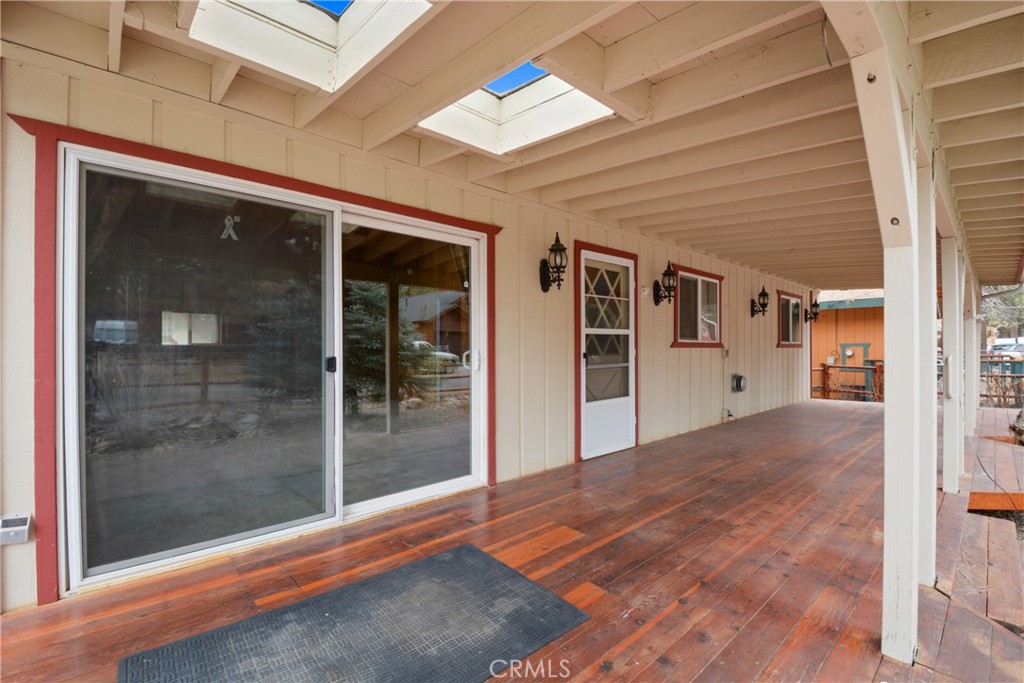Welcome to this charming single-level mountain retreat in Big Bear City, set on an expansive lot surrounded by mature trees and outdoor living spaces. This well-maintained 2-bedroom, 1¾-bath single-family home offers comfort, character, and flexibility—ideal as a full-time residence, weekend getaway, or investment opportunity. Both bedrooms feature ensuite bathrooms, providing privacy and convenience. The living room is warm and inviting with tongue-and-groove pine, skylights, a ceiling fan, and a recently installed fireplace insert for cozy mountain evenings. A swamp cooler helps keep things comfortable in warmer months, and the included wood rack adds both function and rustic charm. The kitchen blends vintage appeal with modern updates, featuring classic cabinetry, a breakfast bar, built-in cooktop, oven/broiler, new stainless-steel dishwasher, and a newer stainless-steel refrigerator. Indoor-outdoor living shines here. An 8-foot sliding glass door opens to a beautiful redwood porch, perfect for relaxing or entertaining. The primary suite includes access to an enclosed patio with a wall heater, which also houses washer/dryer hookups with a gas connection. The rear patio features durable Trex decking, and the property is enhanced by apple, apricot, and pear trees, along with a stately blue spruce. Additional exterior highlights include a 2-car garage with two doors, gas and water already run to the garage, offering a potential ADU conversion (Buyer to verify with local authorities.), and a wood/garden shed with a concrete floor. With its generous lot size, thoughtful updates, and mountain character, this Big Bear City home offers a rare combination of comfort, charm, and future potential.