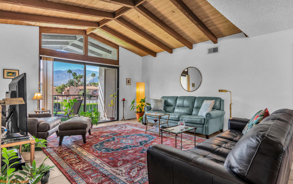 Welcome to the lush, gated community of Ramon Estados, perfectly situated in the heart of Palm Springs. This centrally located gem offers easy access to downtown, shopping, and Palm Springs International Airport. Step inside to discover a bright and airy living space, highlighted by stunning wood-beamed ceilings that lead you to a private balcony with breathtaking mountain views. Freshly painted and featuring a brand-new HVAC system, this home offers both comfort and style. The primary suite boasts a newly remodeled shower, and the bedrooms are fitted with plush new carpeting. Abundant storage ensures everything has its place. There is also a private storage locker along with a place to store your bike. Enjoy the fantastic community amenities, including two tennis courts, two sparkling pools, a pickleball court, a sauna, a gym, and on-site laundry facilities. The clubhouse is currently undergoing renovations, promising even more to look forward to. For added convenience, the community also offers open, uncovered parking. Experience the best of Palm Springs living at Ramon Estados!