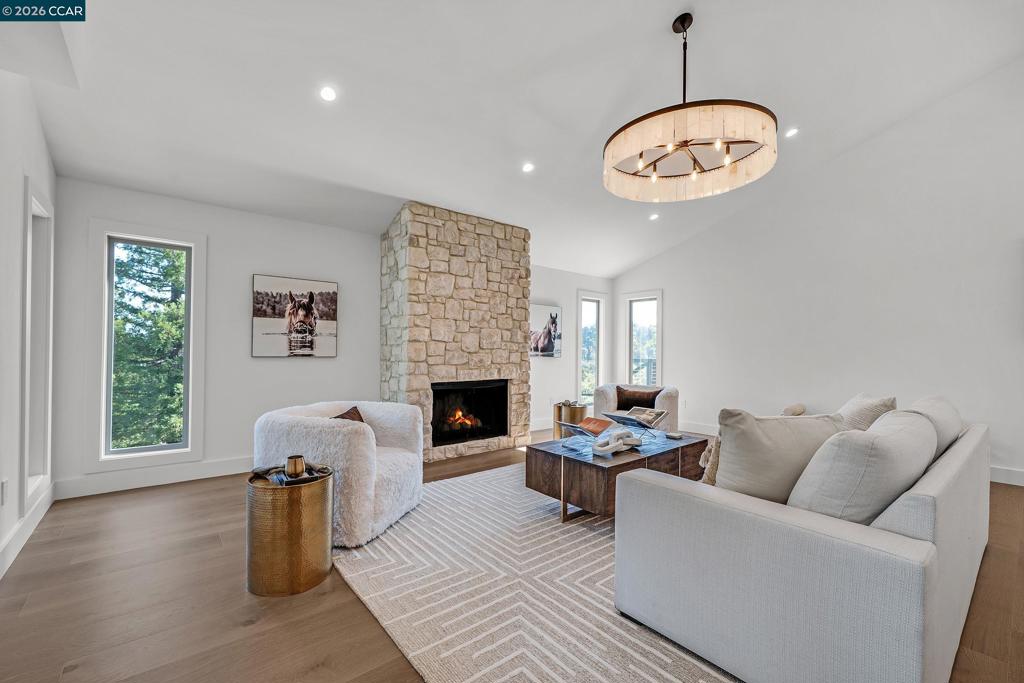 Tucked away on a private and secluded 1.91 acre lot in Lafayette’s sought after upper Happy Valley area near Olympic Oaks, 1059 Lizann Drive offers breathtaking views, exceptional privacy, and a rare sense of serenity while remaining just minutes from downtown Lafayette, BART, Highway 24, and Lafayette’s highly regarded schools. This beautifully reimagined 5 bedroom, 4.5 bathroom home spans approximately 3,900 square feet and has been extensively updated throughout with new composite exterior siding, new roof, new plumbing, new electrical, new windows, designer finishes, engineered hardwood floors, new baseboards, and recessed lighting. The phenomenal layout is ideal for everyday living and entertaining, highlighted by a massive living room with a stunning stone gas fireplace and abundant natural light from expansive windows and skylights. The chef’s kitchen features a breakfast bar, six burner gas range with griddle, double oven, walk in pantry, and a sink overlooking the backyard oasis. The private primary suite captures incredible views and a spa inspired bath with dual sinks, soaking tub, and walk in shower. The backyard is a true retreat with a newly upgraded pool, large grassy area, expansive patio, and sweeping hillside views. Perfect for relaxing or hosting gatherings.