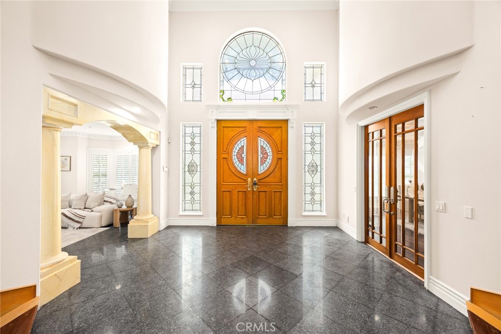 This Gorgeous & Elegant 2 story custom estate located on Beautiful and Quiet neighborhood with distinguished Arcadia School District. It features private security gated, stately 2 column studded entrance leads to a grand foyer under cathedral ceiling featuring a magnificent crystal chandelier. Downstairs of the main house: wood-paneled library; marble-floored living room; large newly remodeled built-in shelf for ample storage spaces . Family room with a newly build wet bar connected to the fully remodeled gourmet kitchen behind dining room and a fully remodeled separate wok kitchen. 2 bedroom suites, plus a 1/2 bath as the powder room for guest. Upstairs: 2 hard wood staircases connected downstairs; 4 bedroom-suites with common area for study or recreation; Jacuzzi tub, steam room, 3 walk-in closets and retreat area inside the master suite against with beautiful view of San Gabriel mountains. Palm trees surround the detached guest house(1500 sqft) with permit for entertainment , Sparkling pool and water fountain. Refinements such as marble, stone, custom-made cabinetry, drapes and built-ins are evident throughout with many stained-glass windows. Front yard features circular driveway and garden with year-round roses and fruit trees. 3-car attached garage plus plenty of car parking space. Walking distance to schools, super-market and multi-cultural eateries. A Great opportunity to own this Luxurious Home !!!