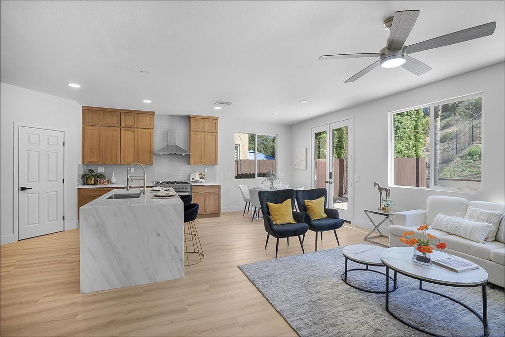Fully remodeled and move-in ready, this 5-bedroom, 3.5-bathroom home offers like-new living with stylish upgrades throughout. The open floor plan showcases Oakwood LVP flooring, fresh paint, new lighting, and abundant natural light. At the heart of the home, the kitchen features quartzite countertops, new cabinetry, and a large island that flows seamlessly into the dining and living areas — perfect for entertaining. The main level includes the primary suite with a spa-like bath, two additional guest bedrooms, and a dedicated office. Upstairs, you’ll find two more guest bedrooms along with a versatile loft, ideal for a playroom, media room, or additional lounge space. Thoughtful upgrades include new plumbing fixtures, fresh landscaping, and modern finishes throughout. The backyard offers a private retreat with two planter boxes for gardening and plenty of room for gatherings. Conveniently located near parks and the golf course, this home blends modern style with comfort and functionality.