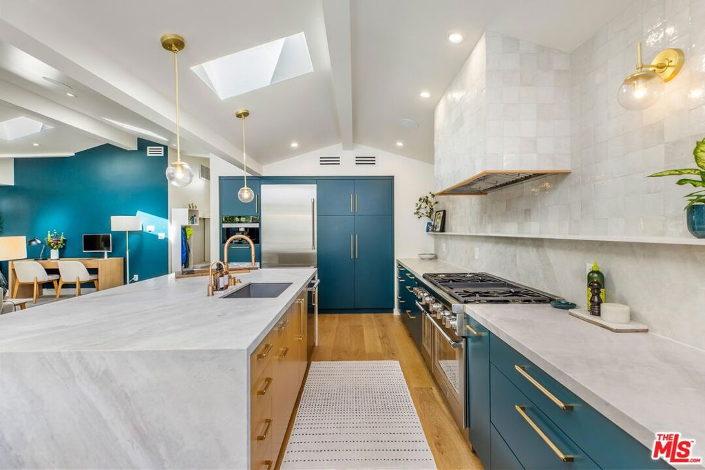Step into this meticulously remodeled home in Valley Village showcasing luxury, sophistication, and timeless character. Spanning 3BD/3.5BA plus a fully permitted ADU, every finish has been thoughtfully curated from rich Zia tile featured in each ensuite bath to integrated smart home features throughout. Upon entry, warm engineered wood floors, high ceilings, and striking accent walls create an inviting first impression. The stunning chef’s kitchen is outfitted with a huge center island, Thermador appliances, a built-in Miele coffee system, dolomite countertops, and a sleek backsplash crafted from handcrafted Cle tile. The living room has custom built-ins and expansive Western sliding doors open to the backyard, creating the perfect indoor-outdoor lifestyle. A stylish powder room just off the kitchen is ideal for guests. Down the hall, the primary suite features soaring ceilings, a walk-in closet, and a luxurious ensuite bath complete with a spacious shower with bench, dual vanity, durable slate tile flooring, and private water closet. Each secondary bedroom offers sliding closet space and its own ensuite bath featuring custom carpentry vanities. Outside, the backyard is designed for year-round entertaining with a heated and filtered pool, a large private lawn, covered patio, and multiple lounge areas. The fully detached ADU includes a kitchenette with stainless steel appliances, waterproof LVP flooring, and a well-appointed bathroom with a step-in shower, ideal for guests, extended family, or rental income. Additionally behind the ADU you’ll find a bonus room that’s perfect for a home office, gym, or storage room. The home also includes a laundry room with side-by-side washer and dryer, surround sound both indoors and outdoors, a four-camera hardwired security system, and value-enhancing and money-saving solar energy system. Conveniently located near the award-winning Colfax Charter Elementary school, Valley Village Park, and some of the valley’s best dining and shopping, this reimagined home offers elevated living with exceptional convenience.