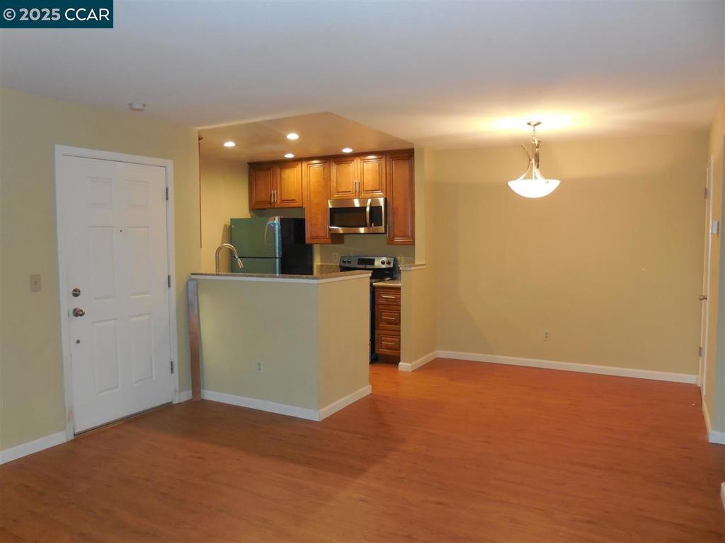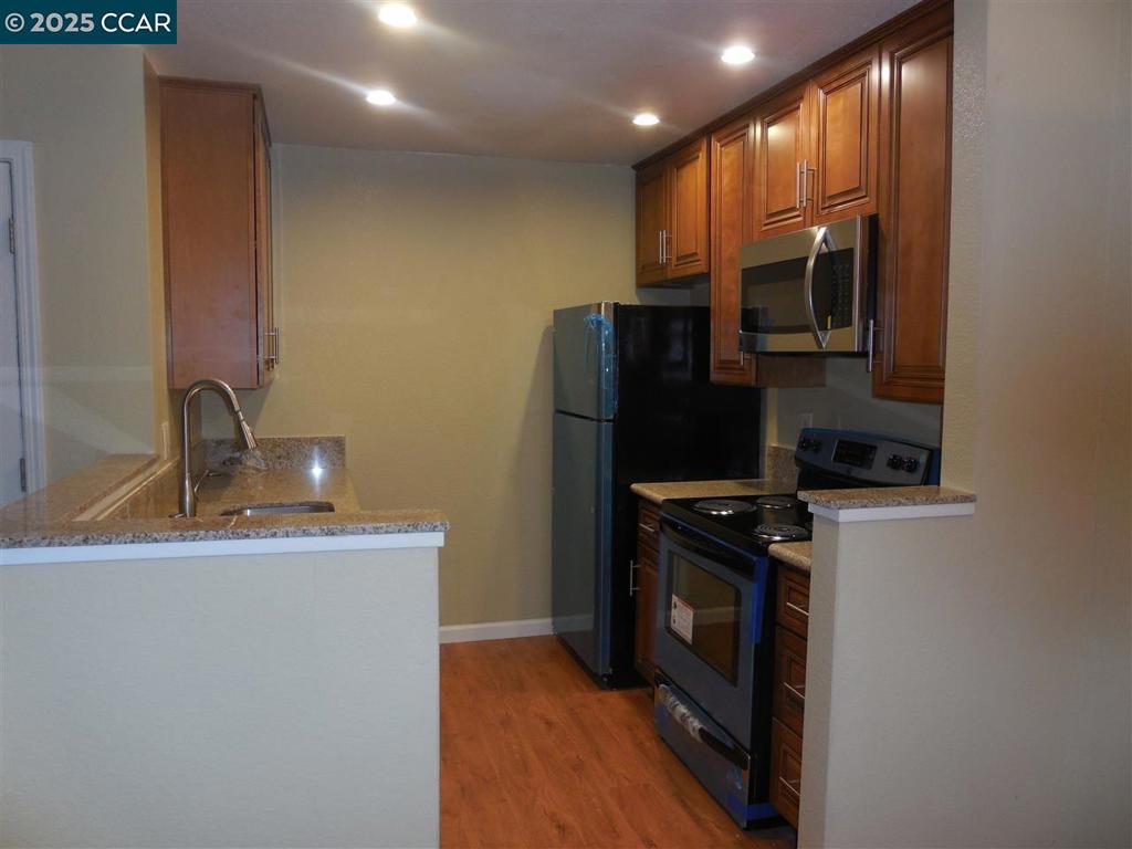 Step into this updated downstairs condo offering comfort, style, and easy living. Enjoy laminate flooring throughout, a beautifully upgraded kitchen with custom cabinetry, granite counters, and stainless steel appliances—refrigerator included. Remodeled bathroom with granite countertop, and the convenience with inside laundry (washer and dryer included). Spacious patio with storage closet. Water and trash is included, and the community provides wonderful amenities including a pool, spa, fitness center, and clubhouse. Ideally located near Central Park, Market Place shopping with Trader Joe’s, Library, The Lot, Iron Horse Trail and minutes to I680. Assigned to top-rated schools, with no steps to entry. A must-see gem! Dogs Ok, Upon Approval. Apply with RentSpree https://apply.link/LqQUlv0