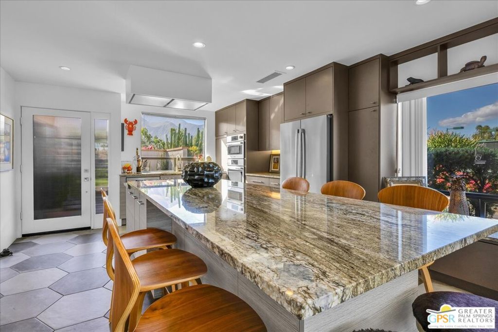 Experience the pinnacle of Palm Springs living in this meticulously reimagined 1,252-square-foot residence. Every inch of this single-level, two-bedroom, two-bath home has been transformed with luxury materials and thoughtful attention to detail. The open-concept layout is centered around a show-stopping Chef’s kitchen, anchored by a 12-foot granite waterfall island with ample integrated storage, top-of-the-line Bosch stainless steel appliances, and a professional Zephyr range hood. Custom cabinetry with dovetail and soft-close finishes provides a sophisticated, tailored feel. From sunset cocktails to gourmet dinner parties, this Chef’s kitchen blends high-design aesthetics with pro-grade performance for a truly elevated entertaining experience. The interior is bathed in light by added clerestory windows and premium Milgard energy efficient windows and doors. Porcelain tile floors flow seamlessly into the bathrooms, which feature custom tile work and lighted vanity mirrors. Additional upgrades include Bali Blinds, custom California Closets, Pelican water filtration system, a 16 Seer Rheem HVAC unit and recessed lighting. Enjoy true indoor-outdoor living from the front and back patios with hand-laid Saltillo tiles and breathtaking panoramic mountain views. Positioned on an incredible interior lot on a quiet cul-de-sac by the pond, bridge and walkways, you are just steps from one of the desert’s most beautifully landscaped gated enclaves. Set within 43 acres of mature, park-like grounds, this premier gated community offers the ultimate desert playground with six sparkling pools, pickleball, and tennis courts. It is a serene sanctuary that feels worlds away, yet sits just minutes from the iconic energy of downtown Palm Springs. Impeccably reimagined and perfectly positioned, this isn’t just a home; it’s your new desert masterpiece.