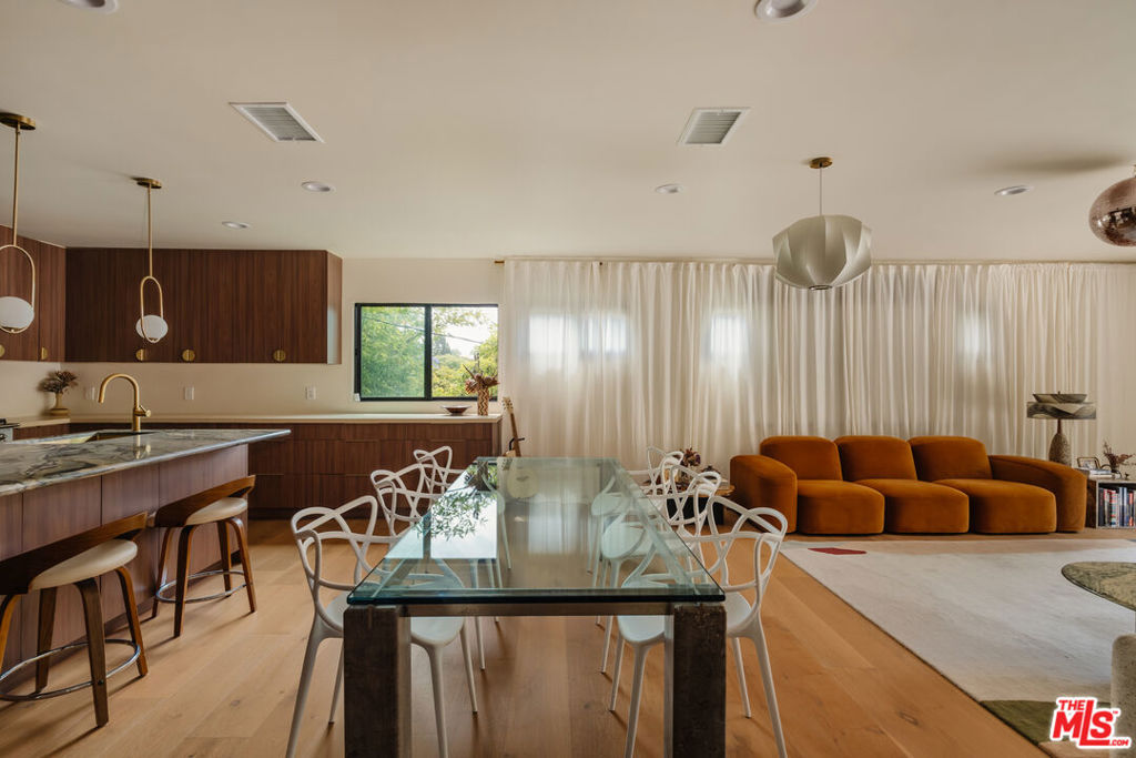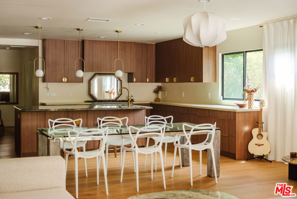 Welcome to 12220 Benmore Terrace, an artfully updated mid-century home situated north of Sunset at the end of a long private driveway, behind gates in the lush hills of Brentwood Heights. Designed by the acclaimed architect A. Quincy Jones, this residence embodies elegance and sophistication. Spanning 4,000 sq ft, the home offers six spacious bedrooms and five luxurious bathrooms, all newly renovated with designer finishes throughout. High-end amenities, such as a La Cornue range and Sub-Zero refrigerator, enhance the gourmet kitchen, which flows into the beautifully appointed living room with accordion doors that open to a sun-drenched patio. The primary suite features a gorgeous spa bath adorned with European tiles and fixtures. A large second bedroom with its own bath and a third en-suite bedroom complete the upper level. Downstairs, you’ll find a separate three-bedroom, two-bath wing with its own family room and kitchenette, opening to the verdant yard and deck, surrounded by mature, lush gardens. The property can be delivered furnished or partially furnished. Parking for 4 cars comes with an electric car charger, while solar panels provide ample power to dramatically reduce the electric bill. Nestled on a sprawling quarter-acre lot, this secluded oasis presents a unique opportunity for someone seeking complete privacy and tranquility in a convenient Brentwood location, just minutes from schools, shops, and restaurants.