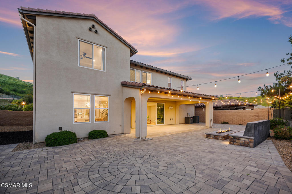 An exceptional opportunity within the gated Meridians of Moorpark. Built in 2017, this impressive cul-de-sac residence offers five bedrooms, five bathrooms, and nearly 3,800 square feet of open, thoughtfully designed living space. The home feels expansive yet inviting, with wood-like flooring, recessed lighting throughout, and generously sized rooms that flow effortlessly from one to the next.The designer kitchen serves as the heart of the home, showcasing a large center island with breakfast bar and pendant lighting, custom tile accents, quartz countertops, bright white cabinetry, and stainless steel appliances. A pot filler at the range adds both convenience and style, while the casual dining area creates an ideal setting for everyday living or intimate gatherings.A grand staircase leads upstairs to a versatile loft and well-appointed bedrooms, many enjoying scenic views of the surrounding hills. The primary suite offers a peaceful retreat, complete with dual sinks, tile flooring, a separate shower, and a sunken soaking tub designed for true relaxation.The backyard is designed for effortless entertaining and quiet moments alike, featuring a spacious paver patio, built-in fire pit with bench seating, custom decking, and a covered patio, all set against sweeping panoramic mountain and hillside views. Located within a secure gated community, this newer home combines space, comfort, and elevated design–creating a setting that feels as impressive as it is easy to enjoy.