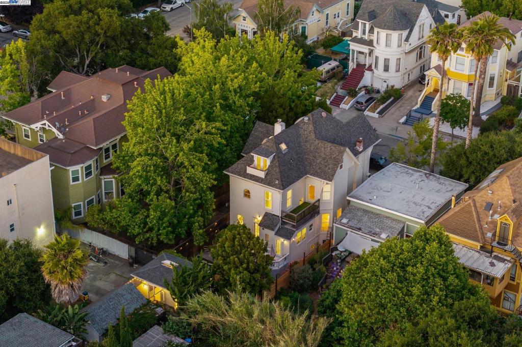 Victorian Architectural Gem with 3,608 sqft of living space enjoy expansive living, a beautiful garden, & magnificent sunsets from this 4 bedroom, 5 bathroom home + detached garden casita on a quiet tree-lined street! Ornate cornices, bay windows, & soaring ceilings give way to rich millwork, vintage fireplaces, & sunlit rooms. Wide-plank oak floors and designer fixtures mix seamlessly with original charm. The elegant living and dining rooms offer timeless appeal, while the updated kitchen opens to a bright flex area ideal for casual gatherings or creative use. Uniquely, the kitchen has two stovetops & two fridges, perfect for cooking/entertaining. Upstairs, the primary suite features a bay-window sitting nook; additional bedrooms showcase period moldings and arched windows. The renovated top floor is perfect as a media room, studio/ retreat & a balcony for those magnificent sunsets! The lush garden includes a raised deck, patio, and mature trees. Large basement with standing room provides ample storage, workshop & wine cellar potential. Located near BART, freeways, & local gems like Mandela Grocery, Kilovolt Coffee, and Farmers Market, this is a rare opportunity to own a piece of Oakland history.
