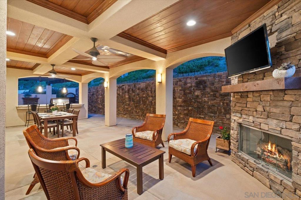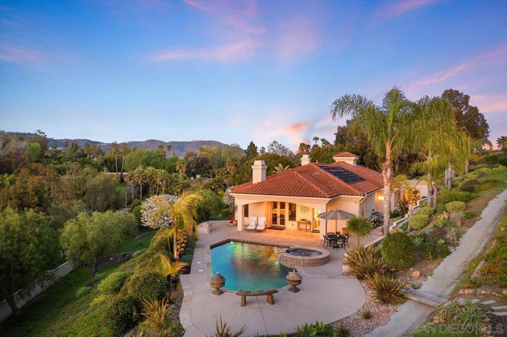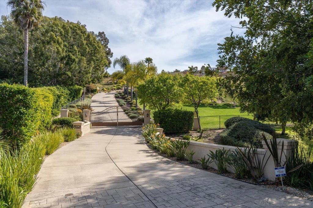 Welcome to this stunning single-level Mediterranean estate in Rancho Santa Fe’s coveted Hacienda Santa Fe neighborhood. Built in 2007 and enhanced subsequently, this home sits on 1.6 acres of mature landscaping with panoramic views. Behind a private gated driveway, the home boasts high ceilings, crown molding, and tumbled travertine flooring throughout. The chef’s kitchen is a highlight, featuring Viking appliances, double ovens, a 48” cooktop, SubZero refrigerator, two dishwashers, and a large center island. It opens to an oversized family room for seamless entertaining. A butler’s pantry with wrought iron doors and two wine refrigerators leads to a formal dining room. Adjacent is a casual dining area, ideal for informal gatherings. A custom-built office with a fireplace and bay window offers a quiet retreat. Down the hallways are four generous en suite bedrooms, include a secondary primary suite with a spacious bath. The primary retreat includes high ceilings, a cozy fireplace, panoramic views, and a spa-like bathroom with a large walk-in closet. Step outside to a private oasis featuring a salt-water pool, spa, fire pit, outdoor pavilion with BBQ, and a stone fireplace. The four-car garage has epoxy floors and built-in cabinets. This rare estate offers luxury, privacy, and convenience in one of Rancho Santa Fe’s most desirable neighborhoods. Located in a top-rated school district, this home has no mello-roos and low HOA fees.