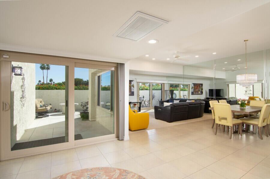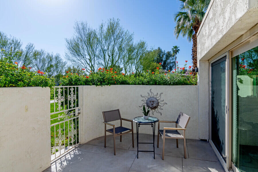 Beautifully reimagined with a thoughtfully expanded floor plan, this residence showcases a recently remodeled, modern open-concept kitchen with custom cabinetry that flows effortlessly into the inviting living space. Walls of mirrors in the dining and living areas enhance natural light and create a sense of openness.The home features tile flooring throughout, plank flooring in the kitchen, and carpeted bedrooms for added comfort. Offering three bedrooms and two bathrooms, the layout embodies effortless Palm Springs resort living, with direct patio access from both the living room and primary suite; perfect for indoor-outdoor entertaining or quiet relaxation.Step outside to a private, walled patio framed by south and east mountain views, complete with an outdoor firepit for cozy evenings under the desert sky.Additional highlights include a washer and dryer located in the garage, a finished single-car garage with epoxy flooring, and a covered carport.Residents enjoy access to an exceptional array of amenities, including eight heated pools and spas, tennis and pickleball courts, a putting green, and a clubhouse designed for social gatherings and private events.Ideally located adjacent to Tahquitz Creek Golf Resort and the CV Link, the home offers convenient access to golf, hiking, and biking right from your doorstep. Set within a highly regarded 186-residence gated community, the property reflects iconic midcentury modern design paired with sweeping mountain views and a vibrant, welcoming atmosphere.