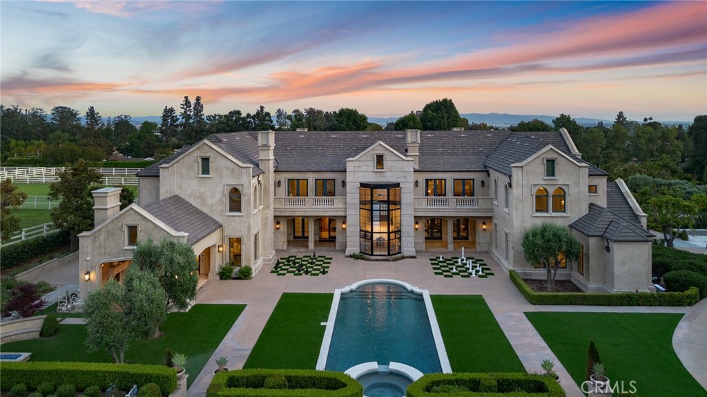 Just Reduced! Set behind private wrought-iron gates in the prestigious guard-gated enclave of Bradbury Estates, 18 Dovetail Lane is a masterfully designed English Tudor mansion that blends timeless architecture with modern luxury across an expansive 2.52-acre lot. With 10 bedrooms and 13 bathrooms, including a private 3-bed, 4-bath guest house, this estate is the ultimate in refined living. The main residence offers 7 bedrooms and 9 bathrooms, showcasing soaring cathedral ceilings, gothic arches, fleur-de-lis detailing, and intricate woodwork. A soft neutral palette accented by antiqued metallics and natural finishes evokes both warmth and grandeur. Custom highlights include a gilded coffered library, gourmet kitchen with artisan cabinetry, secondary wok kitchen, private home theater, and dedicated spa room for ultimate relaxation. Resort-style grounds are equally impressive, featuring a full-size basketball court, life-sized chess garden, sparkling pool and spa, and elegant formal landscaping designed for entertaining and peaceful retreat. With its blend of European elegance and California luxury, this stately residence is a rare offering in one of Southern California’s most exclusive communities.