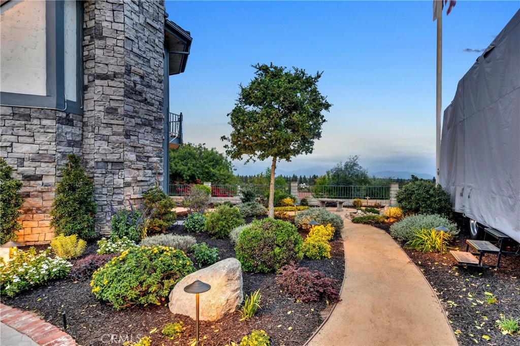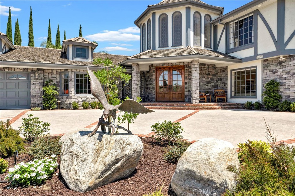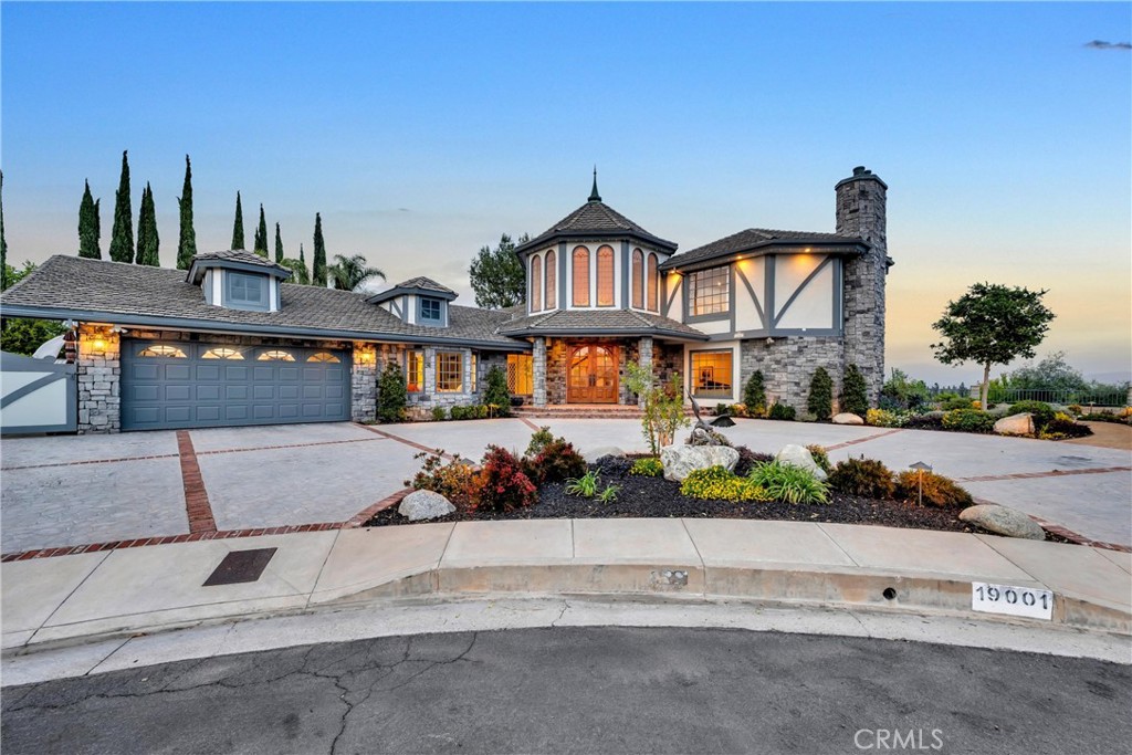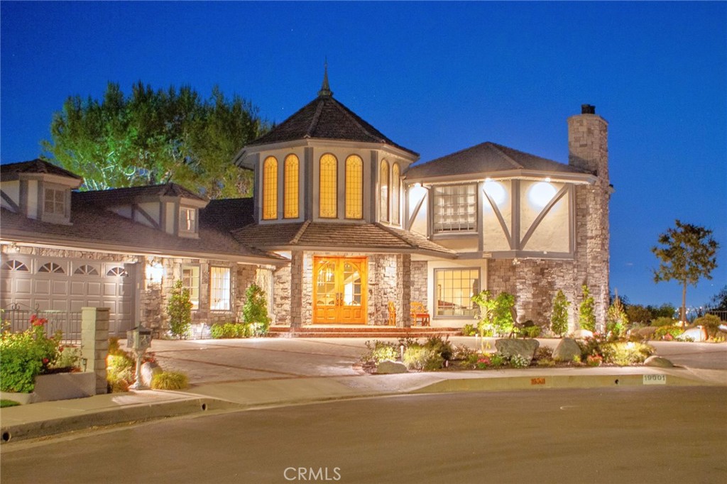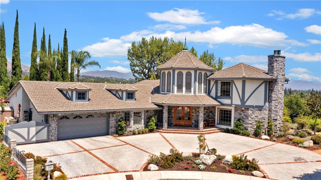 Custom, entertainer’s home, nearly 4,000 sqft, w/amazing valley & mountain views on quiet cul-de-sac in Porter Ranch. Fantastic curb appeal w/circular drive & brick ribbons. RV parking space for up to 40’. Covered front porch leads to double doors w/arched window & opens to formal, 2-story entry boasts leaded & etched glass, clerestory windows, decorative niches, & graceful, floating, curved staircase up to upper story. Blending comfort w/old-world charm, aesthetic touches, and upgrade LED lighting throughout. Step down, formal living room has stately fireplace & contemporary French doors opening out to backyard. Formal dining room has decorative tray ceiling & built-in sideboard w/granite counter & display cabinets. Kitchen is both beautiful & functional w/high vaulted ceiling, brick columns, white cabinets, granite countertops & backsplash, stainless steel appliances, including a 48’ Viking range, & wonderful octagonal island. Sunny, breakfast area offers walls of windows, topped w/ decorative glass, to bring in great views of yard & valley beyond. Comfortable, informal family room is perfect for hanging out w/friends or family, open to kitchen area & boasting tray ceiling & custom built-ins. Convenient powder room is perfect for guests. Office/library has custom built-ins & diamond mullioned windows (could be converted into additional bedroom.) Two good-sized bedrooms w/window seats, share a beautifully appointed, updated hall bath. Primary suite is true retreat w/views of mountains, vaulted ceiling, enormous walk-in closet, French doors to the back patio. Luxurious, en-suite bath has dual vanities, granite countertops, Pella windows, enormous shower, & separate, jetted tub. The house is mostly one story, however, upstairs, in the turret, is a delightful additional living area w/cedar beamed ceiling, large brick fireplace, & Pella French doors out to balcony that soaks in surrounding valley views. Could be 4th bedroom. Outside is generous yard on 13,835 sq ft lot offering patio, pool, firepit, & drought conscious turf. Extensive LED landscape lighting showcases this special home at night. Dedicated laundry room. The 2-car garage is completely finished w/epoxy floor, custom built-in storage cabinets, work bench & utility sink, plus finished attic space w/storage cabinets for additional 325 sqft of insulated storage. Meticulously maintained, pristine, and well situated near shopping, dining, recreation, & entertainment. Don’t let this one pass by.