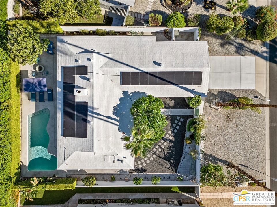This updated and reimagined Mid-Century modern gem in the highly desirable Tahquitz Creek Golf neighborhood offers fee simple land, bright open interiors, and seamless indoor-outdoor living. Offered turnkey furnished, this home is move-in ready for full-time living, a weekend getaway, or income potential. Step inside to a warm living room with a double-sided fireplace and wall-to-wall glass framing the sparkling pool and lush backyard. Multiple patios, fruit and plumeria trees, a fire pit with mountain views, create the ultimate private retreat. Primary ensuite wing with oversized walk-in closet and rear patio access separated from guest bedrooms and bath on opposite side of the home. The updated kitchen features quartz counters, stainless appliances, and a dual gas/electric convection oven perfect for entertaining from intimate dinners to poolside cocktails. Recent upgrades include new bathrooms, new interior and exterior paint, dry bar with beverage center, a new foam roof, polished concrete floors, modern lighting, 22 solar panels with transferable contract, and an EV charger. This South Palm Springs home is convenient to golf, dining, shopping and everything that makes the desert a paradise for homeowners.
