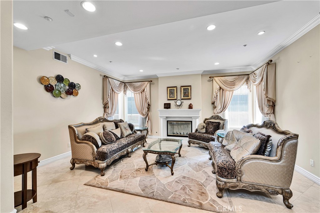 Set behind the gates of Trammell Estate, this Porter Ranch home makes an immediate impression. Enjoy panoramic mountain views and San Fernando Valley city lights stretch across the horizon, visible from both indoor and outdoor living spaces. The entry sets the tone: carved wood doors open to a two-story foyer finished in travertine that carries through the main level. A step-down living room with a fireplace and custom drapery flows into an expansive family room, while an upstairs loft offers flexible space for a media room, home office, or playroom. Five bedrooms and 5.5 baths are spread across the home, with a full guest suite conveniently located on the main floor. The kitchen is built for serious entertaining with an oversized island with a built-in sink, high-end appliances, and generous cabinetry make it as functional as it is well-appointed. Outside, the flat half-acre lot has been put to excellent use. A custom pool and spa, gazebo, fire pit, built-in BBQ, and a large covered patio surround a wide grassy lawn. A wonderful setup that works equally well for a quiet evening or a large gathering. Minutes from top-rated schools, premier shopping, fine dining, and freeway access, this is a well-located, well-appointed estate in one of the valley’s most desirable communities.