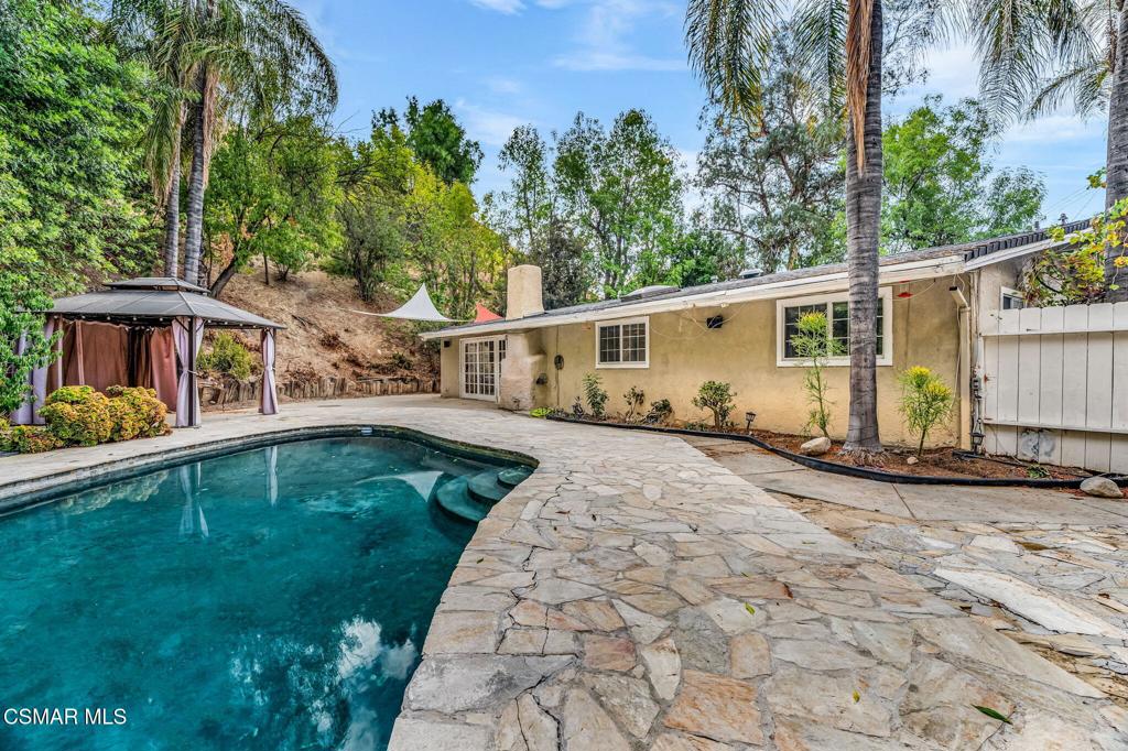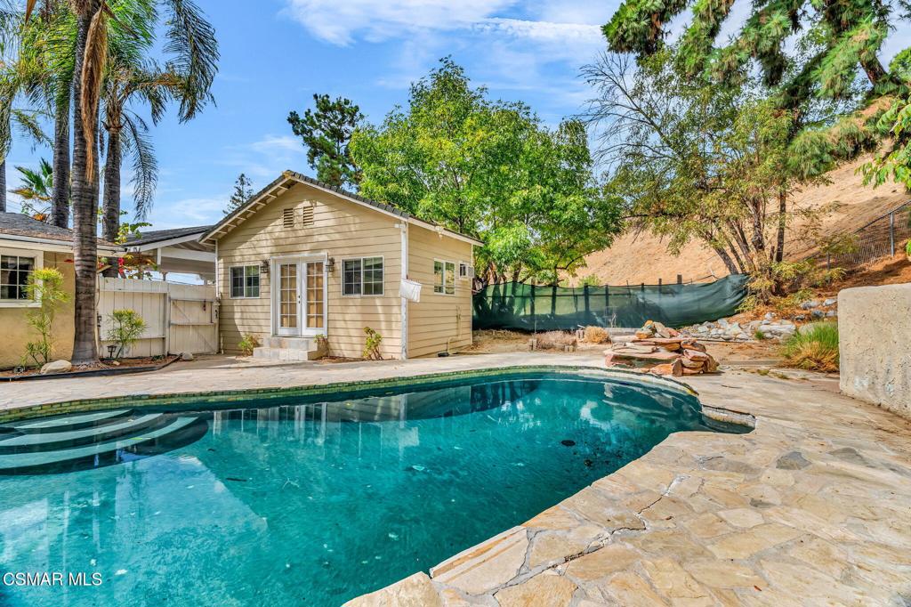 Calling all HANDYMEN!! This secluded property is priced to sell quickly at $990,000 which considers everything this property HAS and DOES NOT HAVE! Sitting on almost 28,000′ lot, this four-bedroom/3 full bath, (TWO are primary suites!!) single family – single story home has over 3,200′ of interior space (including several additions that may or may not be permitted). There is a newer gated driveway and fence that leads to two large carports and the residence. There is a double door entry, spacious living room and dining room with 2 sliding French doors to exterior, a large updated granite kitchen with gas cooktop island with stainless steel hood, double ovens, stainless steel farm-style sink with garden window overlooking side yard, ample storage, recessed lighting, dishwasher, refrigerator and breakfast room with built-in secretary. Indoor laundry room with washer/dryer included. Additional features: Plantation shutters, walk-in closets in the both primary suites, tall baseboards, vaulted ceilings, ceiling fans, skylights, 2 fireplaces, 2 HVAC systems, 2 water heaters, vinyl and tile flooring throughout. There is a large flagstone patio surrounding the pool in the rear yard, an outbuilding that would be ideal as a pool changing room, home office, art studio, playroom or…ADU?! There are several sheds and storage areas dotted throughout the property and a covered gazebo. All this in a great private location close to Kaiser Permanente, Woodland Hills Academy, shopping and convenient freeway access.