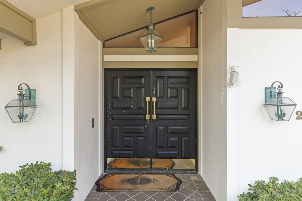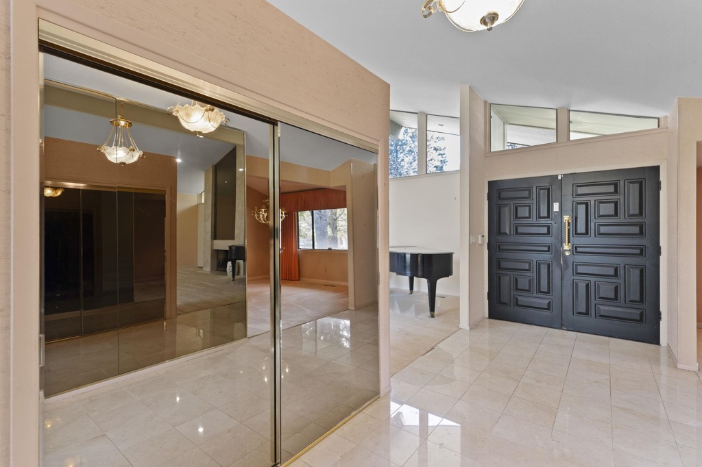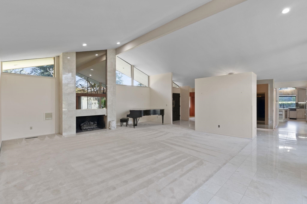 Nestled within a beautiful, tree-studded, staffed-gate community, this exceptional single-story estate offers approximately 4,000 square feet of living space on a flat three-quarter-acre lot backing to open space. Designed to embrace natural light, the home features expansive floor-to-ceiling windows, vaulted ceilings in the grand formal living room, and extensive glass throughout that seamlessly brings the outdoors in. Ideal for both everyday living and entertaining, the private built-in pool is uniquely surrounded on three sides by the home, creating a serene and secluded retreat. Additional highlights include four spacious bedrooms, three full bathrooms and one partial, two fireplaces, and a three-car garage. Situated on a quiet dead-end street, this diamond in the rough presents a rare opportunity to remodel and create your dream home in a truly special setting—perfect for gathering with friends and family while enjoying privacy, space, and timeless potential.