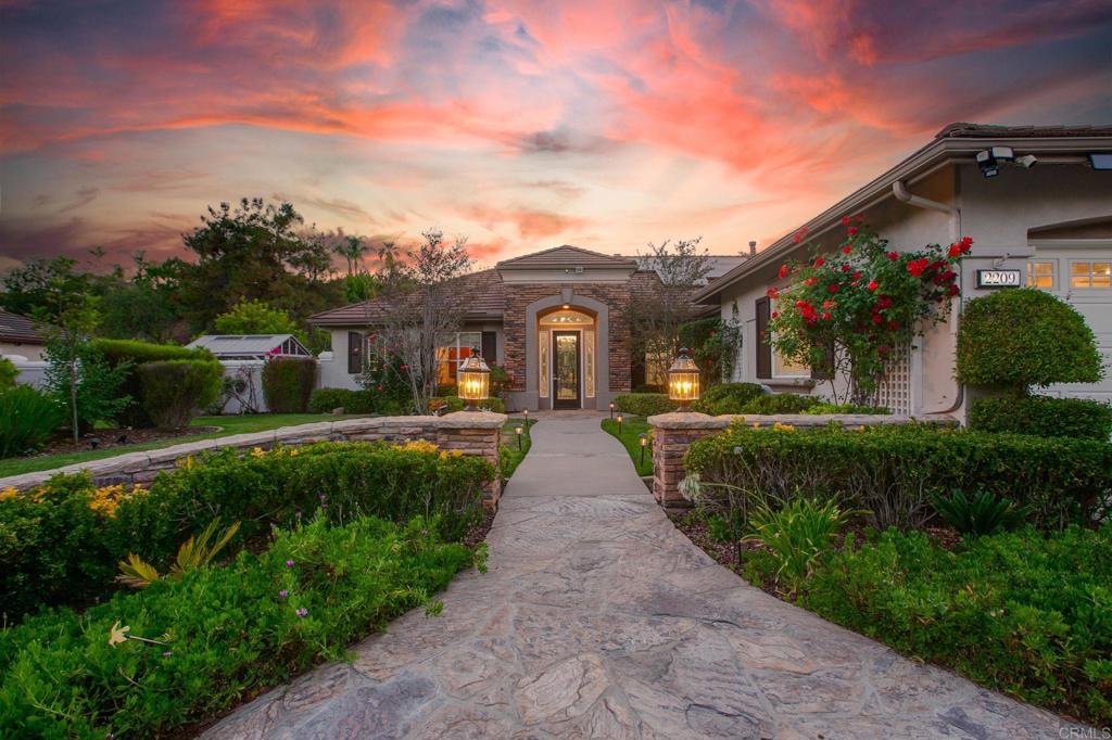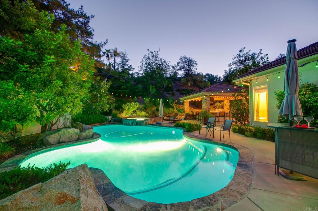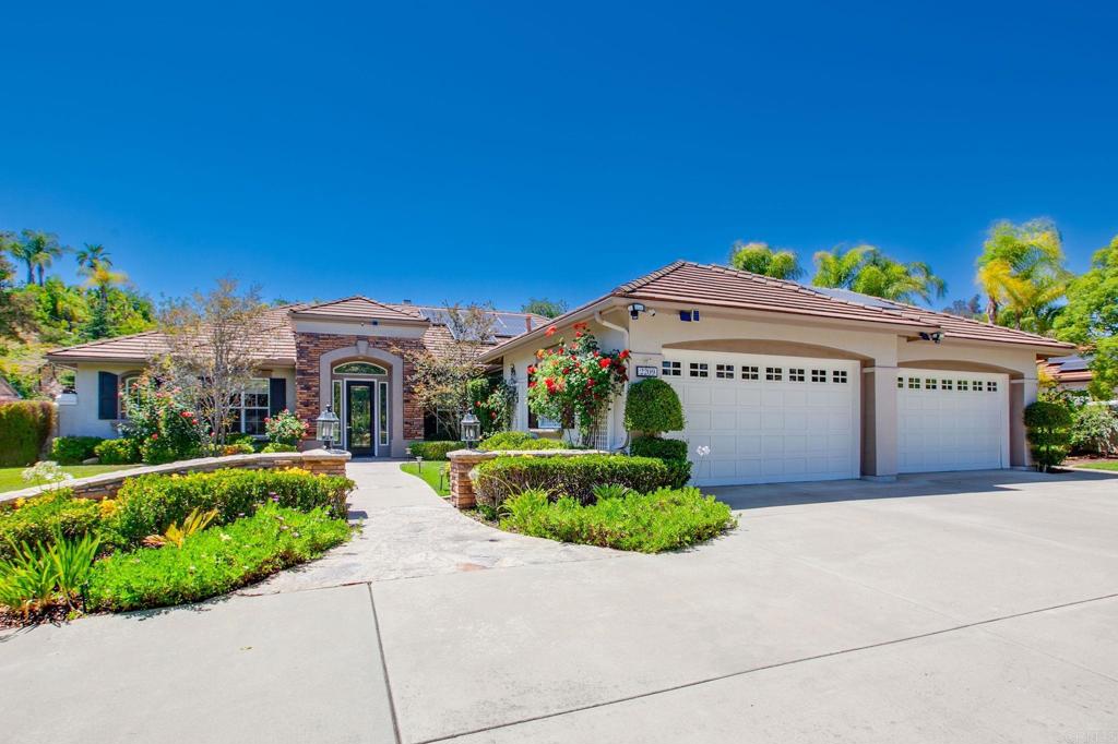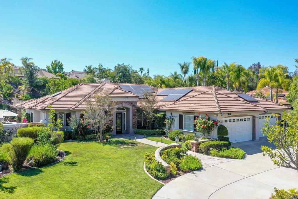 Experience unparalleled luxury in this exquisite single story estate, a private oasis nestled within the exclusive Rancho Verde Estates. Welcome to your personal resort. Custom-tiled, formal foyer with a dramatic rotunda welcomes you. Soaring 10-foot ceilings and extensive crown moldings set the tone for this masterfully designed residence. The seamless flow of this single-story home with no Mello-Roos or HOA fees offers unparalleled convenience and accessibility. The formal living room, adorned with a marble fireplace and bespoke mantel, boasts stereo speakers, recessed art lighting, and custom built-in cabinetry. At the heart of the home, the gourmet center island kitchen features a show-stopping waterfall island with newly installed marble countertops. An adjacent butler’s pantry, is complete with a Sub-Zero wine fridge and elegant glass cabinets. The family room, wired for surround sound, offers a marble fireplace and a built-in entertainment center, creating a calming space for relaxation. Discover an entertainer’s paradise designed for the ultimate resort experience. The magnificent backyard boasts a Sparkling heated Pool and Spa complemented by a serene waterfall and a tranquil koi pond. Gather with friends and family in the incredible outdoor gourmet gazebo kitchen. This fantastic covered area, complete with stainless steel appliances and a Dacor grill, is perfect for lively al fresco dining and making lasting memories. An inviting outdoor fireplace provides the perfect ambiance for gatherings and unforgettable evenings under the stars. Cultivate your passion in the beautiful, fenced-in garden adorned with mature fruit trees. For the golf enthusiast, a private golf area featuring a sand trap, chipping range, and putting green offers endless enjoyment. This exceptional residence also features a dedicated bonus office with a full wall of custom cherry wood cabinets, a four-car garage with built in storage, and advanced systems including an OWNED solar system, high-efficiency appliances and dual-zone heating and air. The primary bedroom, a sanctuary of comfort, includes a built-in entertainment center, linen cabinets and a serene sitting area with bay windows. The luxurious primary bath boasts a double vanity with stunning marble countertops. All bedrooms have ensuite bathrooms. More than just a home it’s your own personal paradise.