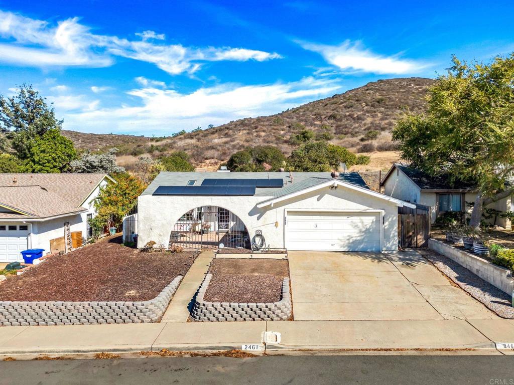 Welcome home to 2461 Trace Road! This spacious 1,792 sqft home features a welcoming open floor plan with vaulted ceilings. With 4 bedrooms and 2 bathrooms, this home includes a cozy fireplace in the family room, ideal for relaxing nights in. Step outside to enjoy the backyard, complete with easy access to a heated swimming pool—perfect enjoyment in beautiful San Diego. Front living room is currently being used as a spacious home gym. This home features 38 solar panels, water softener, central heat and AC. Enjoy the convenience of being only 20 minutes from Naval bases, beaches, and all that San Diego has to offer!