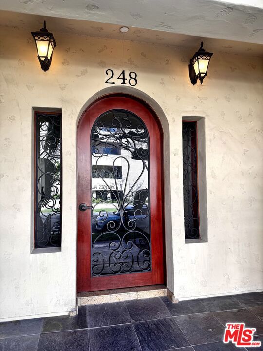 **PERMIT STREET PARKING ONLY**2nd Floor Unit. Beautiful Old World building in the heart in Beverly Hills. Located a short distance from Rodeo Drive. Updated first floor unit with many custom cabinets granite counters, central air/heat, lots of closet space, laundry closet in unit with washer/dryer connections. Living room off kitchen has large windows, hardwood floors and crown moulding. Adjoining kitchen has granite countertops, refrigerator and microwave and dishwasher and gas stove. Service counter with additional cabinetry gives access to living perfect for serving guests. Travertine tile and granite counter in bathroom. Small pets are permitted with additional deposit.