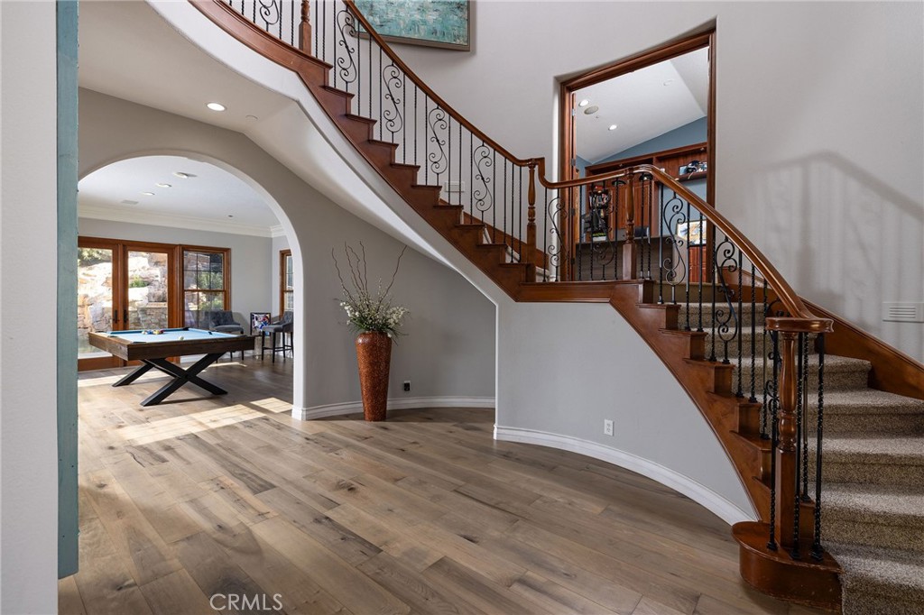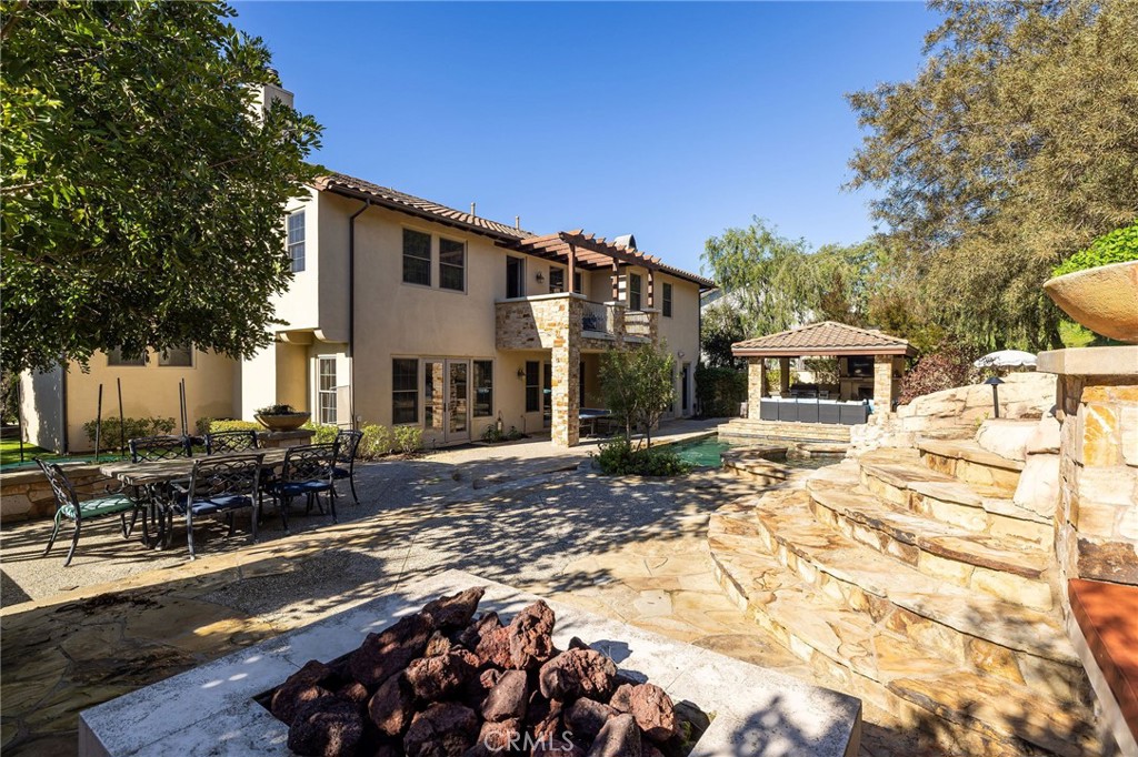 Located at the secluded end of a cul-de-sac within the prestigious equestrian community of Nellie Gail Ranch, this Altamura William Lyon home is designed for the ultimate resort lifestyle. The property features a backyard oasis featuring a sparkling pool with slide and bar seating, spa, fire pit, in-ground trampoline and California room complete with TV and fireplace. The generous interior is set around an inviting inner courtyard with a fountain and detached bed/bath casita perfect for hosting guests. Inside the main residence, the foyer makes a statement with soaring two-story ceilings and a dramatic wrought-iron spiral staircase. The family room flows into a gourmet kitchen with an expansive center island and walk-in pantry for seamless hosting. Numerous French doors throughout the open-floorplan living and dining rooms encourage a natural flow between the interior spaces and the outdoors. Upstairs, an executive office located on the mid-level offers a quiet workspace, while a loft with custom built-in bookshelves and a substantial upstairs bonus room provide ample space for recreation or study. The upper level also houses the primary suite, a sprawling retreat featuring a private sitting area and a secluded patio overlooking the backyard, and the 3 remaining secondary bedrooms. Beyond the property lines, the Nellie Gail Ranch neighborhood offers access to a clubhouse, tennis and pickleball courts, swim facilities, and 25 miles of trails. This home unlocks a sought-after lifestyle and location that you won’t want to miss.