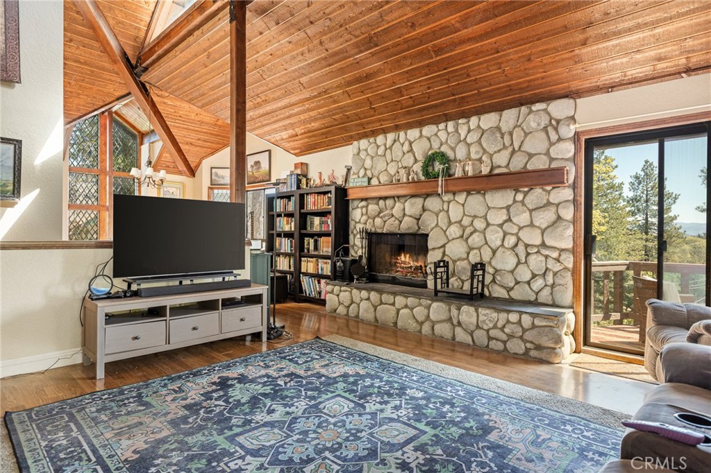 Charming mountain retreat located in the desirable Lake Arrowhead community with lake rights!. This 3-bedroom, 2-bath home offers 1,497 sq ft of living space on a 10,475 sq ft lot, surrounded by trees for a peaceful, private setting. Built in 1984, the home features classic alpine details including vaulted beamed ceilings and tongue-and-groove wood finishes throughout. Newer roof and exterior paint. Main level includes a bedroom and full bath, along with an open-concept living area. Living room is highlighted by a floor-to-ceiling river rock fireplace, creating a warm and inviting focal point. Kitchen offers a breakfast bar and flows into the dining area, ideal for everyday living and entertaining. Property includes an attached 2-car garage with level entry and an extended driveway providing ample additional parking. Enjoy tranquil forested surroundings while being conveniently located near local amenities, recreation, and all that Lake Arrowhead has to offer. Ideal for full-time living, second home, or investment opportunity.