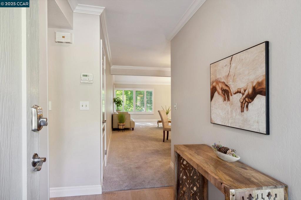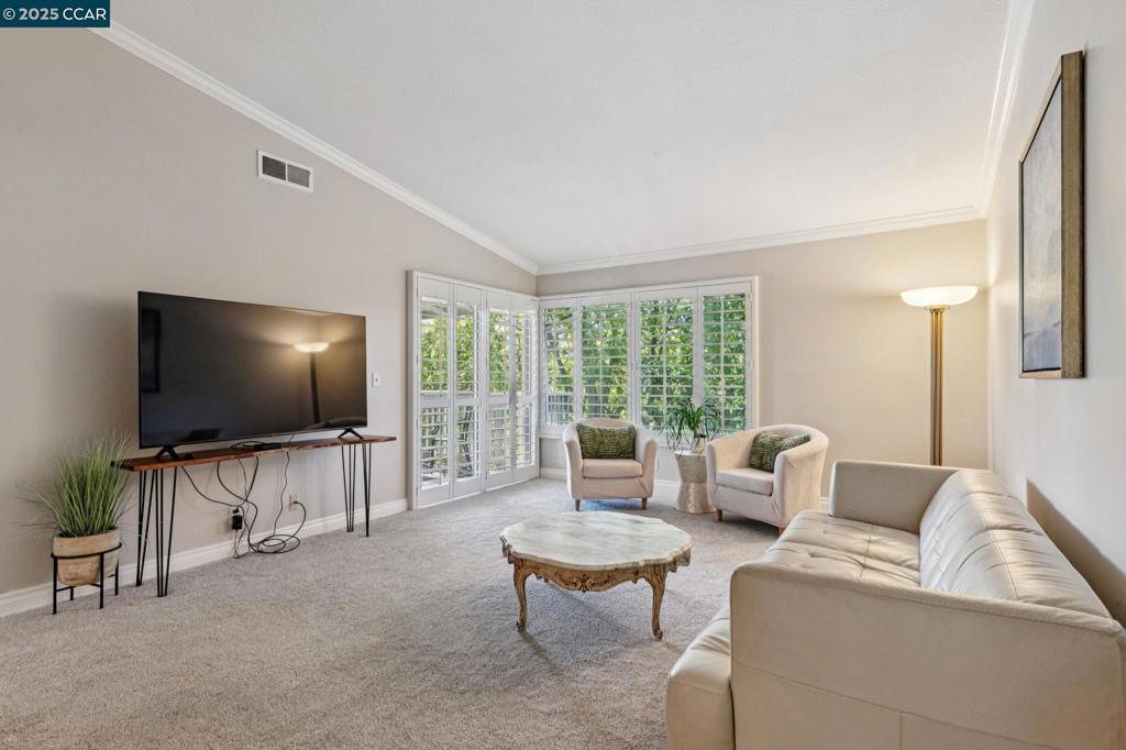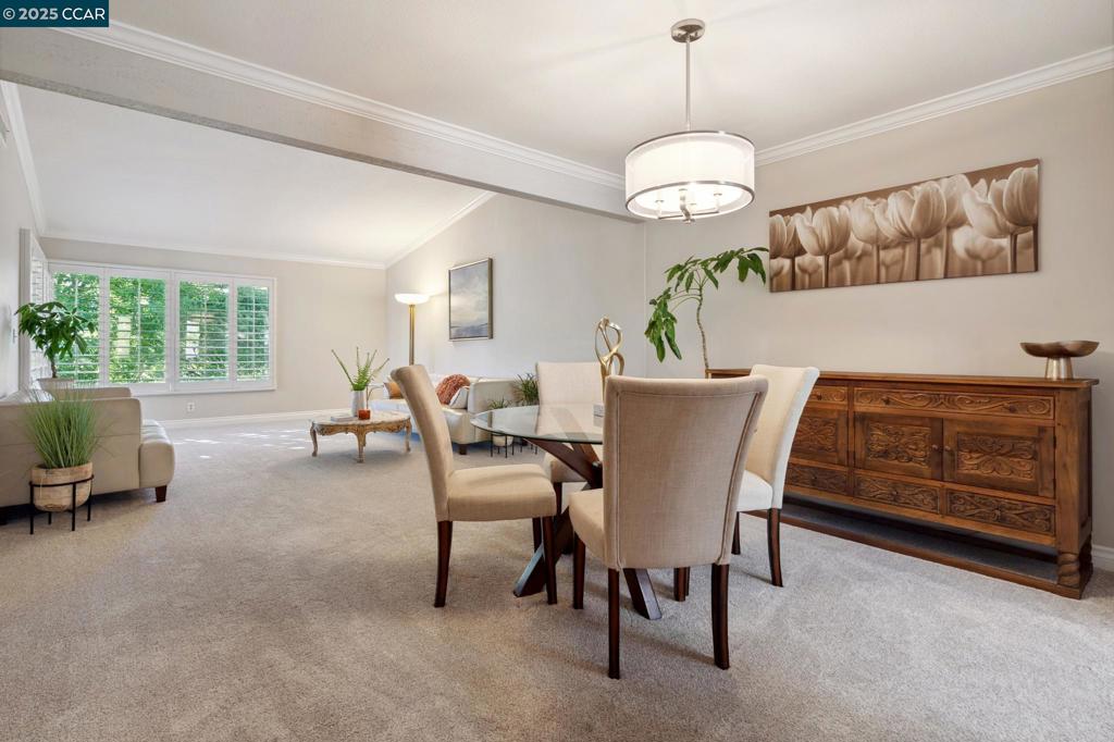 Amazing New Price! Enjoy sunsets & views of the serene surrounding hills in this wonderful Mariposa model. This Rossmoor gem is set above it all, tucked up the hill with/ a western outlook and offers a very private setting on the desirable Eastern side of the valley. If you love the quiet, you have it here! Bright, eat-in kitchen has updated cabinets with pull-out drawers, designer lighting, & Stainless-Steel appliances. The spacious Living/Dining room has a vaulted ceiling with large windows that are covered with elegant plantation shutters. Primary retreat has a skylight, vaulted ceiling and access to a private balcony. Crown molding + high baseboards throughout. Updated elegant Hall Bath, interior doors & carpet. The carport is located next to the entry with a roomy storage closet. The previous owner parked their car and golf cart in the space. Convenient electric plug in carport storage. Plenty of guest parking nearby. This condominium is a must-see to fully appreciate! Enjoy the Bay Area’s première Active 55+ community featuring golf, gym, pickle ball, lawn bowling, clubs, classes, lectures and a plethora of other activities.