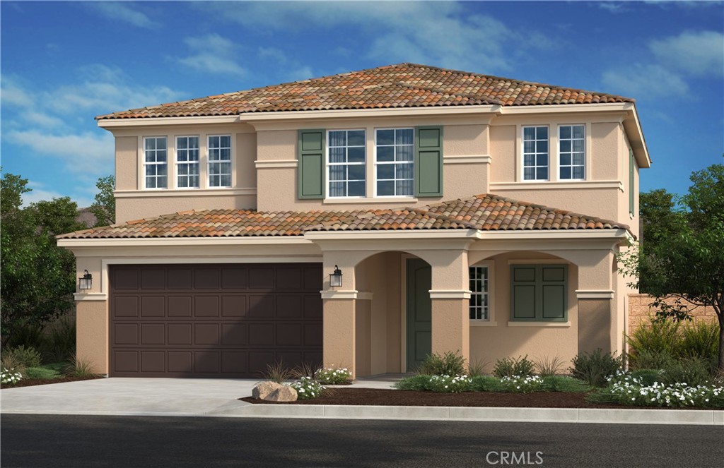 Beautiful Oak shade community a two-story Spanish style home. We make it easy to view our move-in ready homes with self-guided tours! This home comes with 9-ft. ceilings on the first floor and 8 ft on the second floor and eco-friendly features include a solar energy system (purchase or lease required), LED lighting, electric charging station pre-wiring and smart thermostat. It has a patio and cover. The Primary bedroom comes with tub and shower. Photo is a rendering of the model. Buyer can either lease or purchase the Solar.