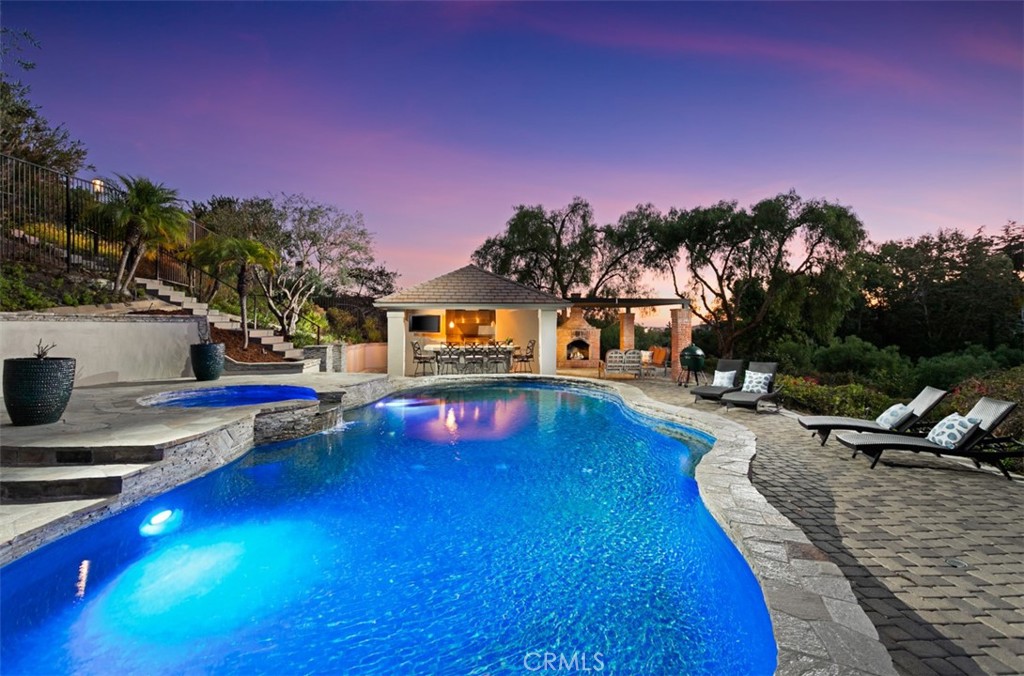 Enveloped in privacy and prestige, this custom single-story estate is gracefully positioned at the end of a secluded cul-de-sac within the highly coveted, guard-gated community of Hunt Club Estates in San Juan Capistrano. Resting on nearly one acre of entirely usable land, the residence is a masterpiece of timeless craftsmanship and modern sophistication, framed by lush, manicured grounds and breathtaking vistas of the ocean and surrounding mountains. A long, gated driveway introduces the home, offering both elegance and seclusion. Inside, rich hardwood floors and bespoke architectural details create a refined ambiance throughout. Light-filled living spaces flow seamlessly, with French doors opening to expansive terraces and gardens. The grand kitchen serves as the heart of the home, boasting open-beamed ceilings, two generous islands, a suite of professional-grade appliances, dual dishwashers and ovens, and a spacious walk-in pantry. Designed for both culinary artistry and casual gathering, it opens to a relaxed dining niche and an expansive family and game room featuring a sit-up wet bar and seamless indoor-outdoor transitions. The residence also includes a distinguished library with a fireplace and custom built-ins, an elegant living room, and a formal dining room ideal for hosting. The serene primary suite is a private retreat, complete with French doors to the patio and a spa-inspired bath offering a sunken tub, dual vanities, a walk-in shower, and a boutique-style walk-in closet. The estate’s outdoor living is equally extraordinary. A winding staircase leads to a resort-style lower level, where a sparkling pool and spa with cascading waterfall are complemented by a fully appointed outdoor kitchen, covered dining area with brick fireplace, and a pool house with an additional bath and storage. Expansive grounds provide endless possibilities, framed by sweeping views and a sense of unrivaled tranquility. There is drivable access to the lower lot too! Every detail has been carefully curated, from beveled glass doors and windows to crystal chandeliers and custom tile work, resulting in a residence of enduring beauty and grace. Blending sophistication, privacy, and impeccable design, this is an extraordinary opportunity to own one of Hunt Club Estates’ finest properties.