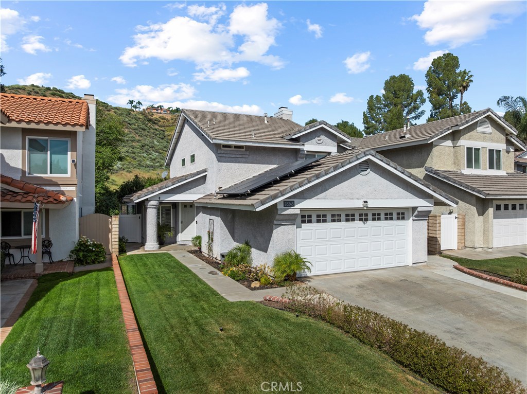 Welcome to this beautifully upgraded two-story pool home offering 4 bedrooms, 3 bathrooms, and 1,701 square feet of thoughtfully designed living space. From the moment you enter, you’ll appreciate the warmth of real hardwood flooring, elegant crown molding, and an abundance of natural light that creates a bright and inviting atmosphere throughout. The remodeled bathrooms showcase modern finishes with sleek quartz countertops, while ceiling fans in every room enhance comfort year-round. The spacious kitchen is a true highlight, featuring newer stainless-steel appliances, granite countertops, a full backsplash, and picturesque views of the backyard and pool—perfect for both everyday living and entertaining. The open-concept layout flows seamlessly into the family room, where a cozy fireplace creates the perfect gathering space. A desirable downstairs bedroom offers flexibility for guests, a home office, or multi-generational living. Step outside through two charming French doors to your own private backyard retreat. Backed by scenic hills for added privacy, this outdoor space is designed for relaxation and enjoyment, complete with a sparkling pool and spa equipped with a new heater and pool sweep. Low-maintenance synthetic sod keeps the yard lush year-round, and new vinyl side gates add both convenience and style. Additional highlights include paid solar for energy efficiency and reduced utility costs, as well as tasteful wainscoting in one of the bedrooms for an extra touch of character. Ideally located in one of the most desirable areas of the community, this home offers a low HOA and is just minutes from parks, shopping, and everyday amenities. This exceptional property truly has it all—don’t miss the opportunity to make it yours.