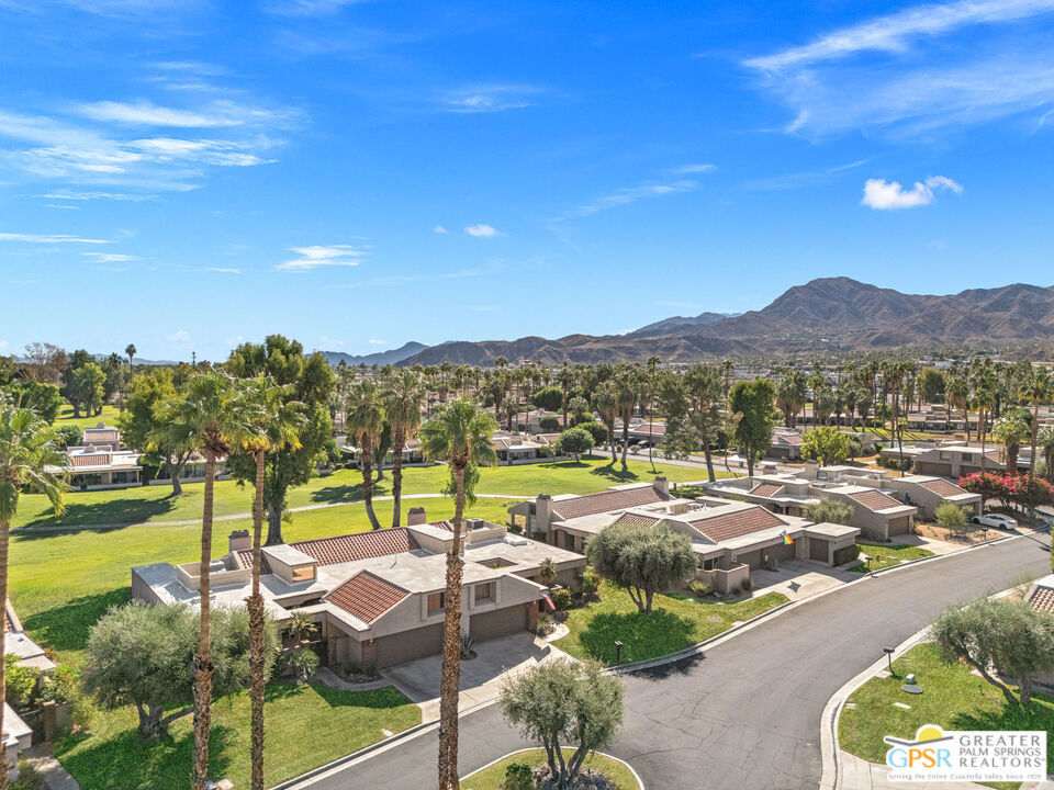 Framed by mountain VIEWS and set along a wide par 5 fairway, this fabulous opportunity at the West Gate of Cathedral Canyon Country Club in South Palm Springs captures the relaxed elegance of desert living with over 1800 square feet of comfort and style. Two large patios take full advantage of sweeping golf course and mountain views, creating a stunning backdrop for outdoor entertaining and everyday enjoyment. Inside, the main living areas feature vaulted and beamed ceilings, a fireplace, and a wet bar that enhance the open, light-filled design. The spacious kitchen with breakfast area opens to the courtyard and offers generous workspace for everyday living and entertaining. The primary suite includes an added walk-in closet and a beautifully updated bath. The guest suite offers comfort and privacy, while the den or office also opens to the courtyard for added light and inspiration. Skylights in both bathrooms enhance the bright, open feel. Direct two-car garage access. Thoughtful upgrades and pride of ownership are evident throughout. Community pool and spa are just a short hop away. Enjoy country club living in a highly desirable South Palm Springs location with reasonable HOA fees and a land lease that keeps ownership simple.