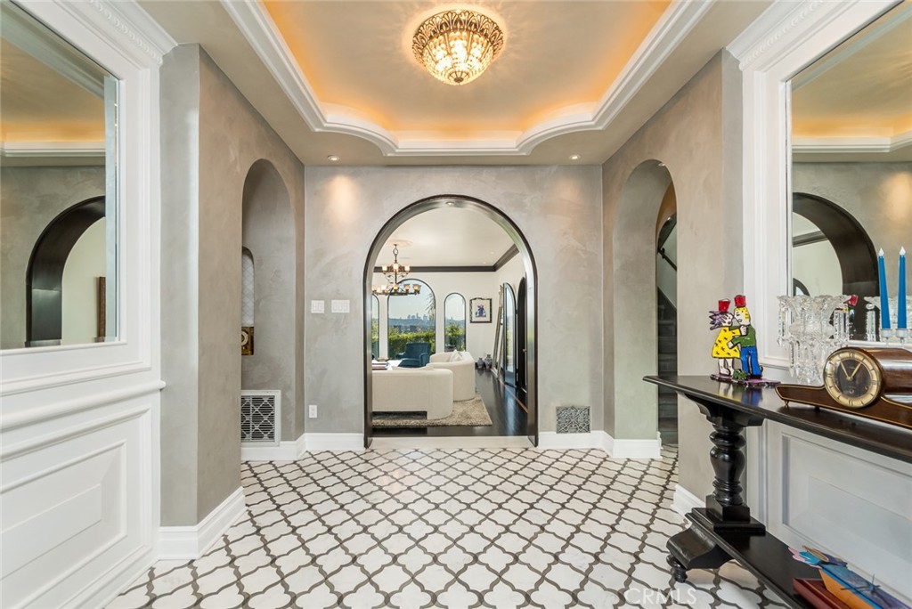 Perched above historic Verdugo Viejo, Lorelei is a rare and commanding Spanish Revival estate offering timeless architecture, exceptional privacy, and sweeping panoramic views stretching from downtown Los Angeles across Glendale and Burbank to the San Gabriel Mountains—and, on clear days, the Pacific Ocean. Originally constructed in 1929 by renowned architect Peter Damm, the main residence spans approximately 7,700 square feet and is thoughtfully designed to honor its historic character while accommodating modern living. A grand gated courtyard with hand-painted Spanish tile and a tranquil fountain sets an unforgettable arrival. Inside, arched doorways, Venetian plaster walls, trellis-pattern marble floors, and rich hardwoods define the home’s authentic craftsmanship. The formal living room is anchored by dramatic windows framing the skyline, while the adjacent family room features an original hand-carved stone fireplace. Entertaining spaces flow effortlessly into a refined formal dining area and a sunlit gourmet kitchen equipped with high-end appliances, breakfast nook, and garden views. The primary suite is a private retreat with commanding vistas, balcony, walk-in closet, spa-inspired bath, and adjacent office or nursery. A private gym and dance studio, discreetly located below, completes the owner’s wing. The estate functions as a true compound, offering a spacious guest house with kitchen and living room, an additional pool house or office, and separate staff or guest accommodations—ideal for extended stays or multigenerational living. Outdoors, lush multi-tiered grounds surround a resort-style pool and spa, multiple dining terraces, and an expansive cabana featuring a full outdoor kitchen, heaters, and built-in entertainment—perfect for intimate gatherings or large-scale events. A private wine cellar and adjoining game room add a final layer of character, reinforcing the home’s legacy as a residence designed for both elegance and enjoyment. A rare opportunity to own a historically significant, view-driven Spanish estate—private, cinematic, and truly irreplaceable.