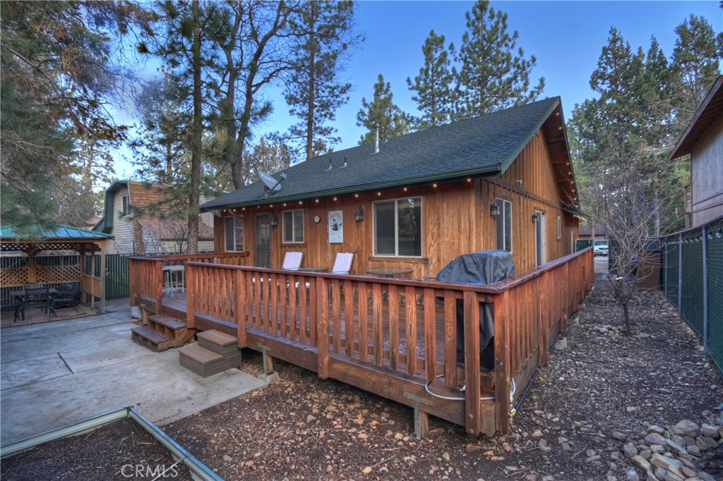 Welcome to 346 Leonard Ln ~ This turn-key, log-style cabin, built in 2005, is located in Sugarloaf near local dining, a market, and Big Bear amenities ~ The inviting interior features vaulted knotty pine T&C ceilings, log accents, recessed lighting, and all-weather vinyl flooring ~ The spacious living room is centered around a stacked-stone fireplace ~ The open-concept layout flows into the dining area, with a modern chandelier, and an updated kitchen featuring knotty pine wood cabinetry, granite countertops, and newer appliances ~ The master bedroom has knotty pine vaulted ceilings to match the living room, along with wood wainscoting ~ Mirrored wardrobes in both bedrooms ~ The home offers two full bathrooms, with knotty pine cabinetry to match the kitchen ~ Laundry closet with stacked washer and dryer ~ Newer central heating and air conditioning system ~ Outdoor living is highlighted by a recently re-finished covered front porch area, and a large rear deck that spans from the sliding glass door in the dining area, all the way around to a door that enters the master bedroom ~ Step down off the rear deck to a concrete patio and covered sitting area, ideal for relaxing or entertaining ~ Bistro lighting found around the perimeter of the home, and much of the fencing ~ Fully fenced back and side yards, with gates on both sides ~ A mix of turf, gravel, and rock adds to the appeal throughout the front yard ~ One-car garage ~ Conveniently located close to skiing, hiking, and Big Bear Lake attractions ~ This move-in-ready cabin offers comfort, style, and versatility ~ Don’t let this Mountain Charmer get away!
