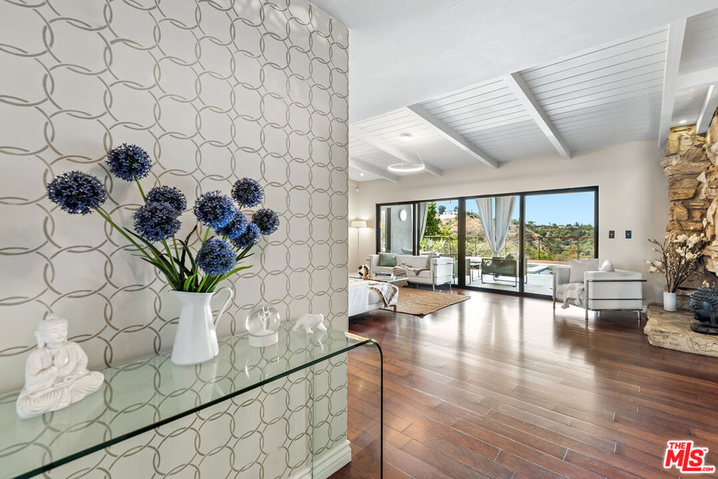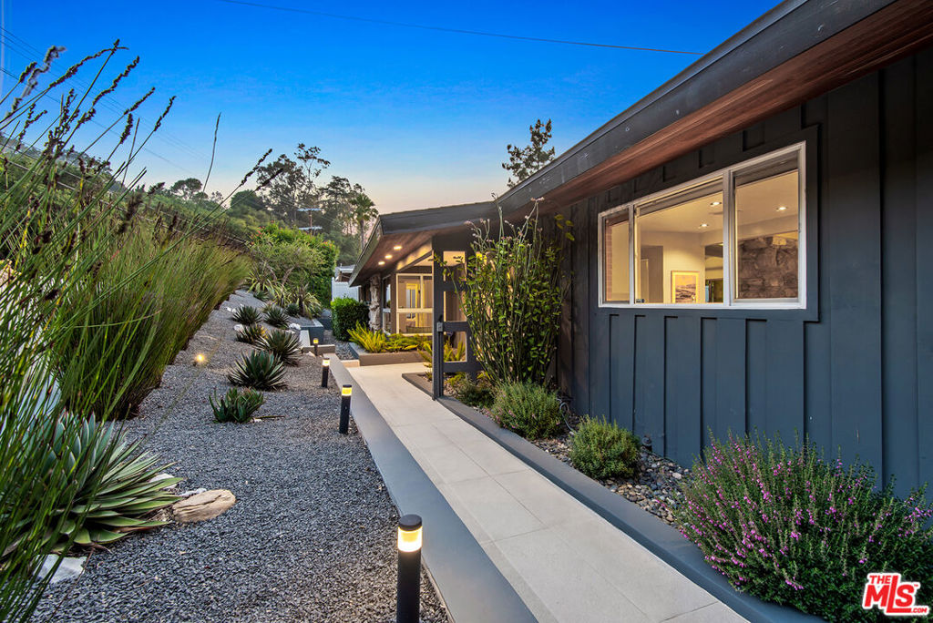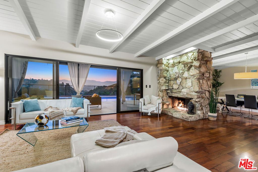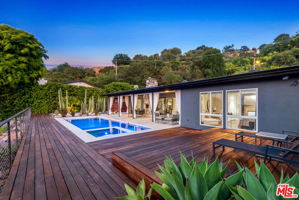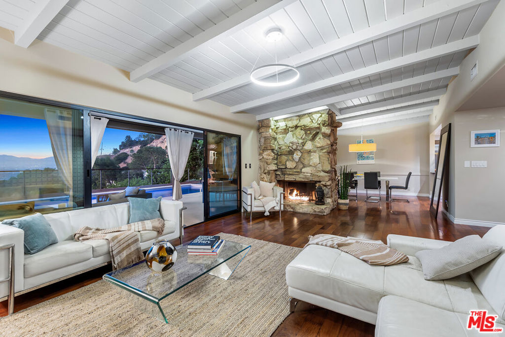 Stunning Mid-Century retreat with breathtaking canyon, mountain, and Valley views. Nestled south of the Boulevard on a secluded private road off Beverly Glen, this exquisite home is a true sanctuary in the heart of the Sherman Oaks hills. Step inside to a sun-drenched, open-concept floor plan highlighted by rich hardwood floors. The bright and airy living room features soaring pitched beamed ceilings and a striking stone fireplace, seamlessly flowing into the elegant dining area. Both spaces have expansive glass doors opening up to the lush backyard haven, creating the coveted indoor-outdoor lifestyle perfect for entertaining. The gourmet kitchen sits just off the dining area, equipped with top-of-the-line Viking appliances, sleek modern white cabinetry, and a brick backsplash. Unwind in the spacious primary suite, where large windows frame serene backyard views and a private door leads directly to the backyard. The luxurious en-suite bath boasts a dual-sink vanity, a soaking tub, and a separate glass-enclosed shower. Step outside to a resort-style backyard oasis showcasing panoramic vistas, a sparkling pool and spa, a wraparound wood deck, a shaded patio, and a fire pit lounge area nestled among mature cacti. Additional features include two generously sized guest bedrooms, modern bathrooms, beautifully landscaped front and backyards, and a two-car garage. Tucked away in a peaceful hillside enclave, this serene escape offers effortless access to both the Westside and the Valley and is just moments from the highly coveted Glen Centre.