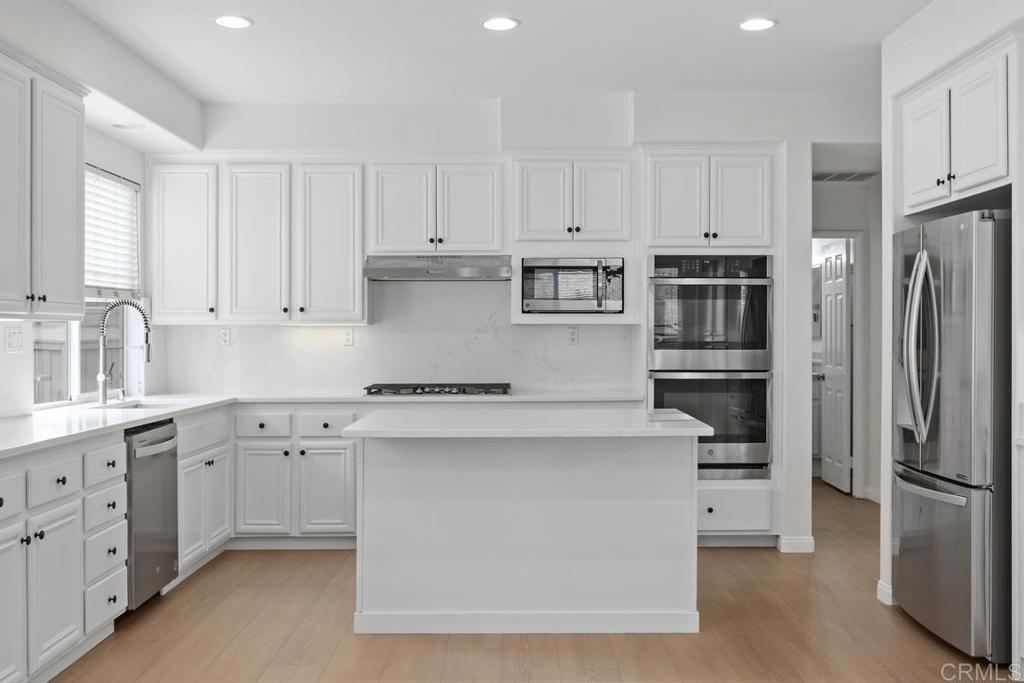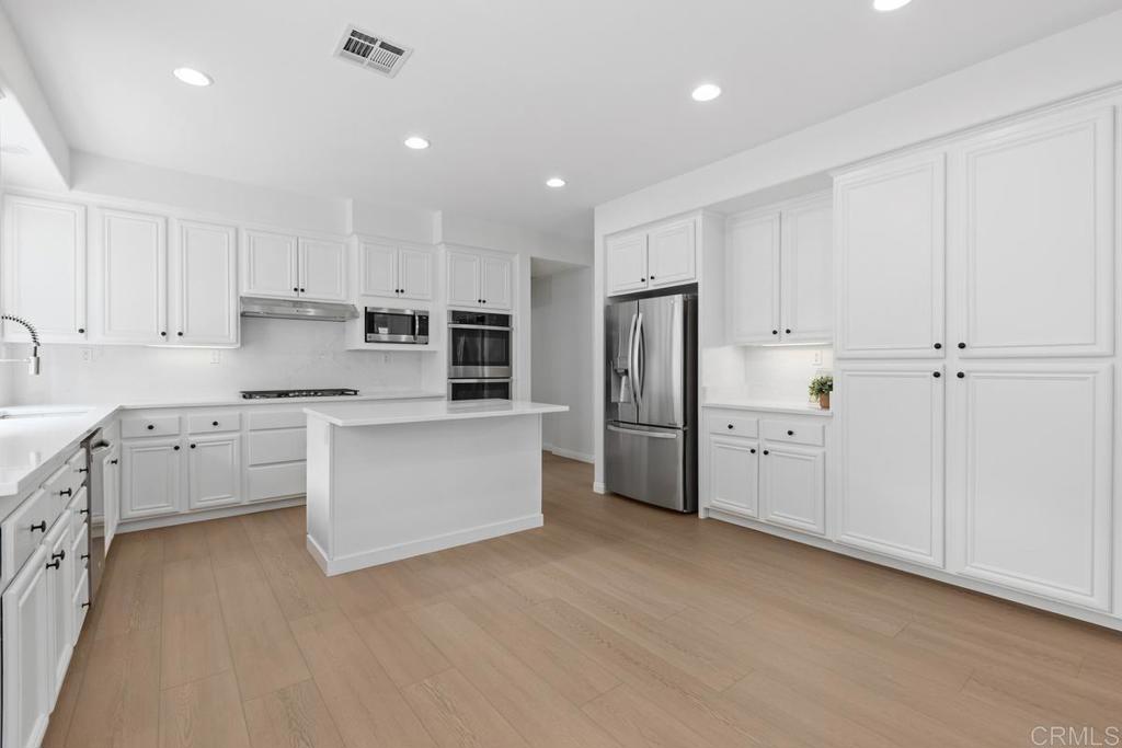 Gorgeous and updated Calavera Hills home offering 4 bedrooms plus a bonus room, a bedroom & full bath downstairs, owned solar, and a large yard with an oversized swim spa. A two-story foyer welcomes you, where new luxury vinyl plank flooring immediately draws the eye, and fresh interior paint adds a warm, inviting feel. The dining room features a wall of windows and soaring ceilings, filling the space with natural light and flowing into a spacious living room ideal for everyday living. The updated kitchen features new quartz countertops with a full backsplash, a large basin sink with a high-arc faucet, classic white cabinetry, and new stainless steel appliances, including a double oven, cooktop, microwave, and exhaust hood. A center island with a breakfast bar opens to the daily dining area and adjacent family room, centered on a fireplace. The main level also includes a bonus room with French doors, a full bath with a walk-in shower, and a laundry room with a sink and cabinetry. A curved staircase leads upstairs with new carpet throughout. The primary suite features a fireplace, two walk-in closets, and a large retreat the size of a bedroom, enclosed with French doors. The primary bath offers dual vanities, a seated vanity, a soaking tub, a walk-in shower, and a water closet. Three additional bedrooms, a hall bath with new LVP flooring, a walk-in linen closet, and an additional linen cabinet complete the upper level. The backyard is designed for entertaining and unwinding with low-maintenance turf, an expansive paver patio, a gas fire pit, an oversized swim spa, and a large paved side yard. Additional highlights include owned solar, newer dual-zone HVAC (2021), water heater (2021), Ring camera system, video doorbell, Ecobee thermostats, ceiling fans, updated light fixtures, and garage door openers. Ideally located near Calavera elementary and middle school, Lake Calavera Preserve with trails, parks, shopping, and a short drive to the beach.