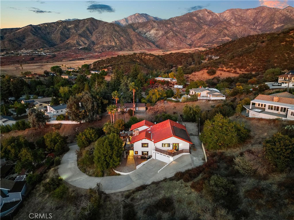 Welcome to an extraordinary hilltop Spanish-Mediterranean retreat with breathtaking mountain and city-light views. Privately positioned on 1.32 acres at the end of a quiet road shared by only four homes, this tri-level estate offers rare seclusion, panoramic scenery, and a lifestyle that feels like a permanent getaway. Spanning 4,371 square feet, the home features 5 bedrooms, 4.5 bathrooms, and a 4-car drive-through garage, thoughtfully designed for multi-generational living and memorable entertaining. From the moment you enter, soaring ceilings, floor-to-ceiling windows, imported wood accents, custom doors, and rich hardwood floors create warmth and timeless character. The dramatic living room showcases 20-foot ceilings, exposed wood beams, a striking stone fireplace, and an architectural catwalk that connects the living spaces while framing the incredible views. The main level also includes a den with built-in bar, formal dining room, spacious kitchen with island, guest bath, and mudroom/storage area—ideal for hosting with ease. This home offers two private primary suites, each with en-suite bathrooms and private balconies. One suite features a spa-inspired jetted tub perfectly positioned to soak in the scenery. The upper level includes a cozy lounge landing, two additional bedrooms, a full bathroom, a large laundry room, and an oversized bonus room currently used as a bedroom and game room. Newer windows and sliding doors open to multiple decks and patios, seamlessly blending indoor and outdoor living. Outside, enjoy a long private driveway, RV and boat parking, additional parking areas, solar power, a sand volleyball court, fruit trees including walnut, and a jacuzzi overlooking the hills—perfect for stargazing and unwinding at sunset. Conveniently located just minutes from Oak Glen’s apple orchards, vineyards, regional parks, and the shops and dining of uptown Yucaipa, yet feeling worlds away. No HOA. Offered fully furnished and ideal as a primary residence, second home, or potential vacation rental. Just 74 miles to Los Angeles and 41 miles to Palm Springs. A rare hilltop sanctuary—schedule your private showing today.