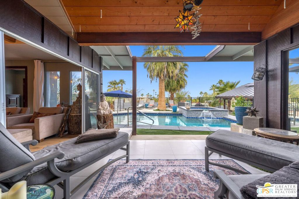 Spectacular Mid-Century home, located high up in the Cathedral City Cove, offered for 1 year (or more) lease. This 2 bed, 2 bath highly upgraded home has been enhanced to enjoy that indoor/outdoor lifestyle the Coachella Valley is famous for. Offered Furnished OR unfurnished, one can start their day relaxing on a chaise lounge under the covered patio, enjoying the sun rise over the nearby mountains. The custom pool/spa creates a tranquil, resort-like setting & the baja shelf w/ umbrella allows for lounging in the pool. Open the slider doors to enjoy the calming sounds of the waterfall. A spectacular eat-in kitchen features ample storage, upgraded appliances/range, add’l under counter refrigerator, and large walnut island. Outdoor bbq is conveniently located just steps away. Separate living and family rooms feature views of the pool. Cozy room off the kitchen features custom woodwork, direct rear yard access, and is a great place to read a book or curl up with your laptop. Indoor laundry closet features side by side units. The spacious primary suite features beautiful views and direct access to the pool. Primary bath features a contemporary dark paint, luxurious glass shower and dual sinks. Secondary bedroom is also spacious, with close access to the guest bath w/shower & tub. Large carport for 2 cars (electric vehicle charging station included!) and additional storage, as well as add’l parking in the driveway. If you’re looking for a highly customized, stunning mid century home only 15 minutes away from Palm Springs, give this one a look! *Please note, ADU & garage on lot is not available* Utilities/services are tenant responsibilities (ask agent for details). Property is NOT available for terms less than 1 year.
