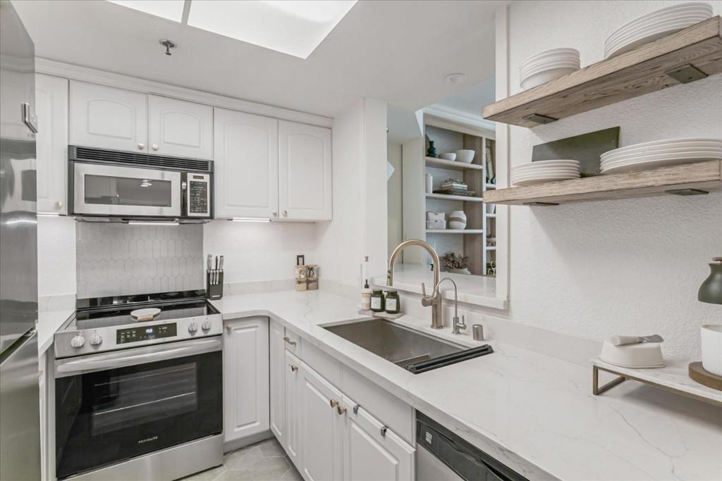 This beautifully updated home, an end unit, features a modern kitchen with newly installed floor tiles and quartz counter tops, along with renovated bathroom floor tile and vanities – all professionally done within the last 2 years. Enjoy the convenience of an assigned garage parking spot right near the elevator and garage door, plus private street parking (just register your vehicle with the city) and additional parking in adjacent lots. Located within walking distance to SAP Center and San Pedro Square, and just across the street from a dog park, this home offers an ideal location for work, play and relaxation. With easy access to Highways 280 and 87, as well as Caltrain and VTA stations, commuting is a breeze. The south facing windows provide an abundance of natural light all day long, and the direct street access to your front door eliminates the hassle of elevators or access keys. Additional amenities include secure lock mailboxes and parcel lockers, a gym room, event space, central AC and heating, a newer stainless steel sink, oven and fresh paint throughout.