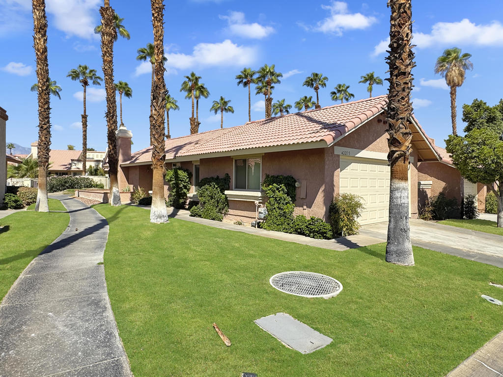 Spacious Oasis Country Club Home with wrap-around patio. Welcome to this light-filled single-level home in the sought-after Oasis Country Club! This rare property is attached on only one side, giving it a true sense of privacy. The massive living room is the heart of the home, featuring vaulted ceilings, a cozy fireplace, and an open-concept layout that seamlessly connects the dining area, breakfast bar, and kitchen. The kitchen is bright and airy with abundant counter space and cabinetry, perfect for cooking and entertaining. Offering three bedrooms (or two bedrooms plus a den/office), the flexible floor plan works for many lifestyles. The primary suite includes a private patio, en-suite bathroom, and generous closet space. The secondary bedroom boasts vaulted ceilings and direct access to the hall bath, while the third room is ideal as a guest space, office, or hobby room.Enjoy desert living at its finest on the expansive wrap-around covered patio, perfect for year-round outdoor dining, BBQs, and gatherings. A greenbelt and mature lemon tree sit just beyond your patio, providing a peaceful view. Additional highlights include newer dual-pane windows, a recently upgraded air conditioning system, and a newer hot water heater. Ceramic tile flooring runs through most of the home, creating a clean, low-maintenance look.Just steps from your door, you’ll find one of the community’s sparkling pools and spas. The Oasis Country Club offers a private 18-hole golf course, multiple pools and spas, tennis and pickleball courts, and even a putting course – all within a gated, beautifully landscaped community. Come see why so many love calling Oasis Country Club home!