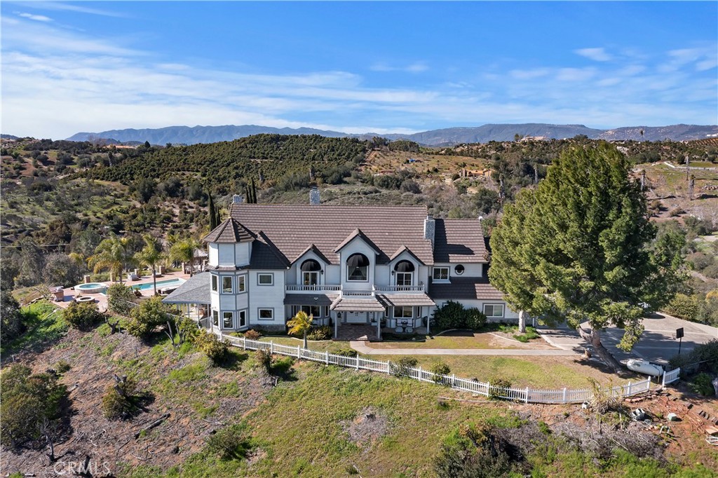 Luxury at its finest with this stunning De Luz Estate pool home. This gorgeous property also includes a 1200 Sq. Ft. guest house with 2 car garage and pool, all just minutes from Old Town Temecula, schools, shopping, dinning, freeway and entertainment. You will be in awe at the spectacular 360 degree views from every room throughout this stunning 4,861 sq. ft. estate home, positioned on a over 5+ acres of impressive land. As you drive up the private driveway, enjoying the breathtaking views, you’ll come upon an orchard that consists of 14 mango and 19 grapefruit trees, you’ll then pass by a lovely guest home with 2 bedrooms and 2 bathrooms, giant balcony, and its own private pool and spa and 2 car garage, excellent potential rental opportunity or for guests, friends or family to live in. When entering the main home through the double front doors, you’ll immediately appreciate it’s grand scale, with the beautiful scrolling iron banister, coffered ceilings, exquisite woodwork, hardwood flooring, and open floor plan with every bedroom consisting of their own bathrooms. Enjoy a cozy evening by the fire, reading a book, or chatting with friends in the lounge/den with beautifully crafted full wall, wood, built-in wine racks and cabinets, granite counters, and wainscot throughout. This room is a must see! Looking to entertain, then you’ll enjoy the huge family room, formal dining room and beautiful kitchen with eating area with never ending views. Need room for guests, no problem, down the hallway you’ll find a bedroom with walk-in closet and a full bathroom. There is also a separate powder room conveniently located off of the family room and a gigantic laundry room with plenty of storage. Upstairs you will be stunned by the craftsmanship. The master bedroom has its own retreat for reading or tv time and the master bedroom has a private 3 sided fireplace. Enjoy a spa day in the master bathroom with jetted tub facing overlooking the picturesque and never-ending views. There are 2 more bedrooms upstairs with stunning full bathrooms and cathedral ceilings, separate bonus area with balcony, and another bonus room with built-in desks and storage for playroom, home office or a plethora of other uses. The backyard of this stunner consists of a pool and spa, bbq and firepit. Sit by the fire and enjoy the stars with your unobstructed view. Looking to have some animals, there is plenty of room for barn, gardens, vines, pickleball court, or whatever you heart desires.