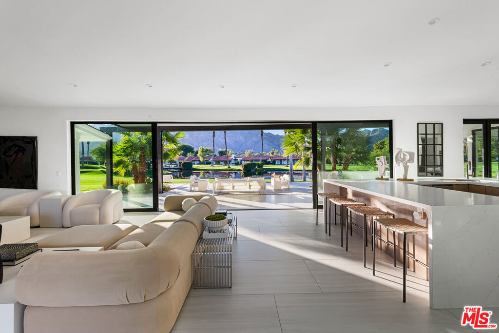 This contemporary desert masterpiece seamlessly blends modern luxury with wellness focused living. Set on a rare double lot overlooking the 4th fairway of The La Quinta Country Club, this nearly 5,000 square foot retreat offers five en suite bedrooms, six baths, and sweeping mountain views. Originally built in 1970, this iconic Steve Chase residence has been thoughtfully reimagined with sleek finishes and state of the art upgrades throughout. Expansive Fleetwood sliding doors create effortless indoor outdoor living, opening to a private courtyard featuring a saltwater pool with tanning ledge, four fountain features, spa, cold plunge, and infrared sauna. The chef’s kitchen is equipped with Thermador appliances including double ovens, dual dishwashers, a gas cooktop, and built in refrigerator, complemented by European cabinetry and a walk-in pantry. A sophisticated wet bar with wine refrigerator, ice maker, and dual beverage refrigerators makes entertaining both elegant and effortless. Two spacious guest suites are located in the southern wing, while the northern wing hosts the primary suite along with two additional suites, ideal for use as a den, office, or media room. The primary suite is a true sanctuary, offering a soaking tub, oversized shower, steam shower, private outdoor spa and garden, and a custom walk-in closet. Offered turnkey, this architectural gem delivers luxurious amenities, impeccable design, and breathtaking views. The expansive double lot of nearly half an acre provides ample space for a casita, ADU, or secondary garage, making this an exceptional opportunity within one of the Coachella Valley’s most coveted golf communities.