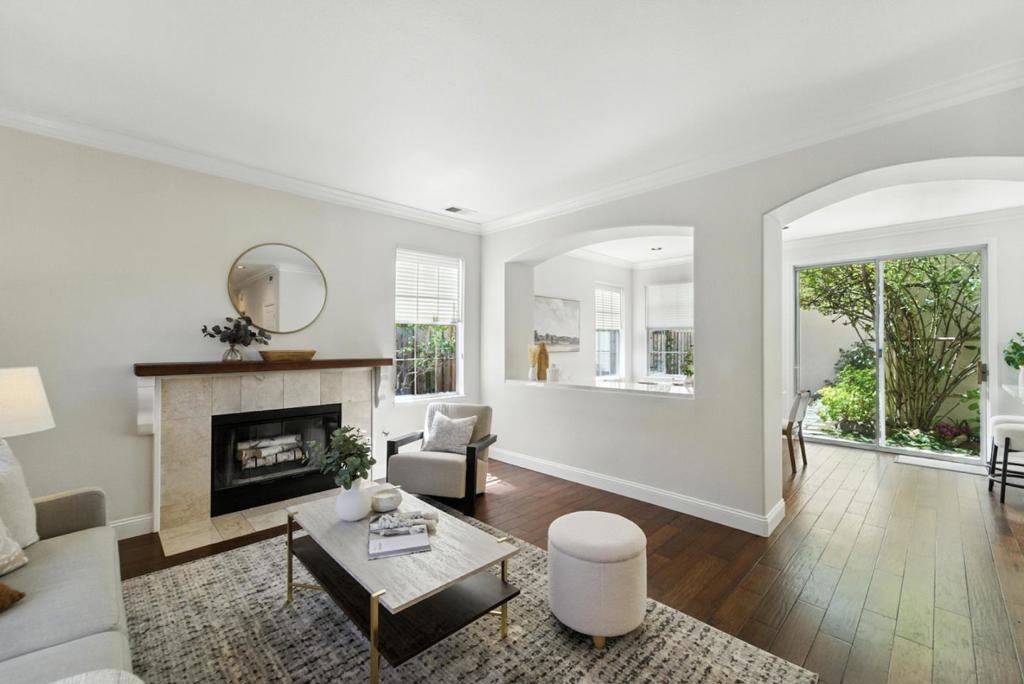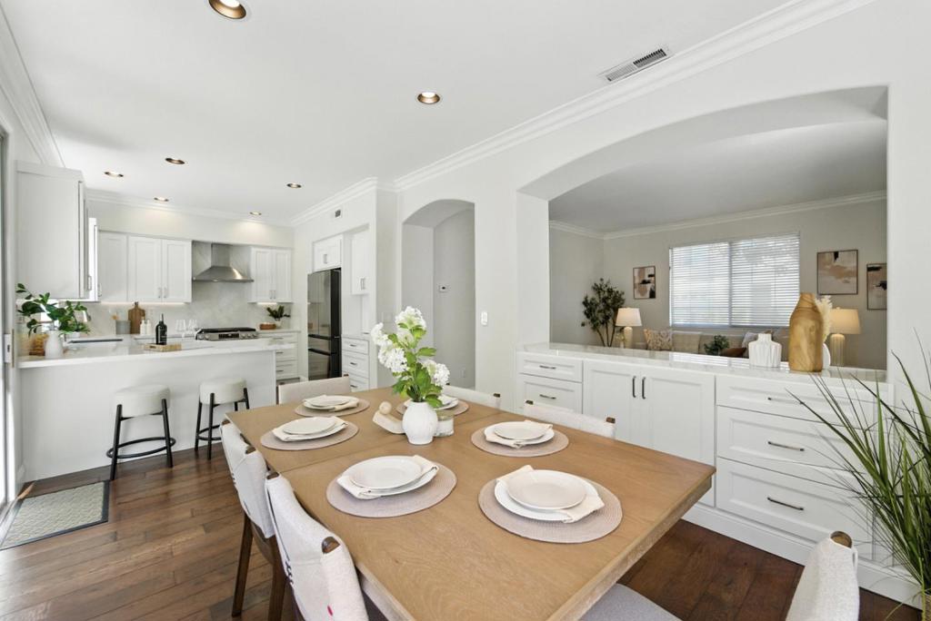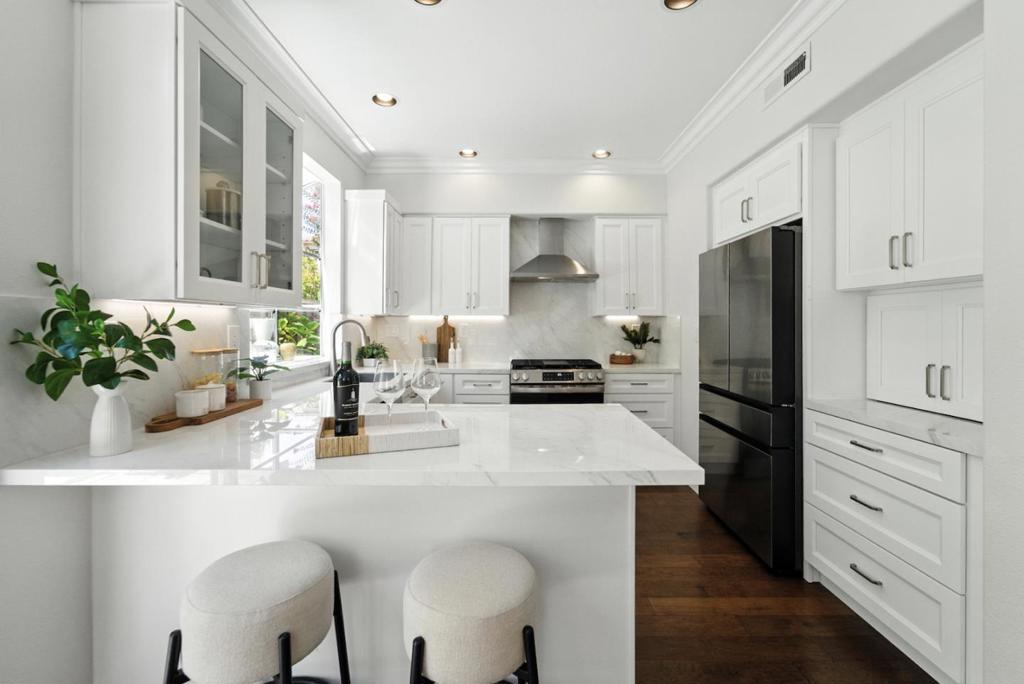 Gorgeous newer design home with sought after high ceilings, luxurious, ultra spacious primary suite with walk in closet, dual sinks, large soaking tub and separate shower plus private water closet. Fully remodeled kitchen with new cabinetry, porcelain counters and newer appliances which include a Panasonic Home Chef microwave/convection oven/airfryer. Dining room buffet cabinetry added for serving and designer storage. The other two bedrooms share Jack and Jill bathroom with quartz counter new sinks and faucets. This bath allows added private bathroom access from both bedrooms. Enjoy the elegance of real wood floors. Lush, private back yard offers space to enjoy al fresco dining, BBQ or time with friends and family. Best of all this home is just steps from Santana Row and Valley Fair mall. This home offers a lifestyle of walking to shopping, restaurants, Farmers Market and movies. 1 yr old HVAC. Roof excellent condition. This home is move in ready to enjoy.