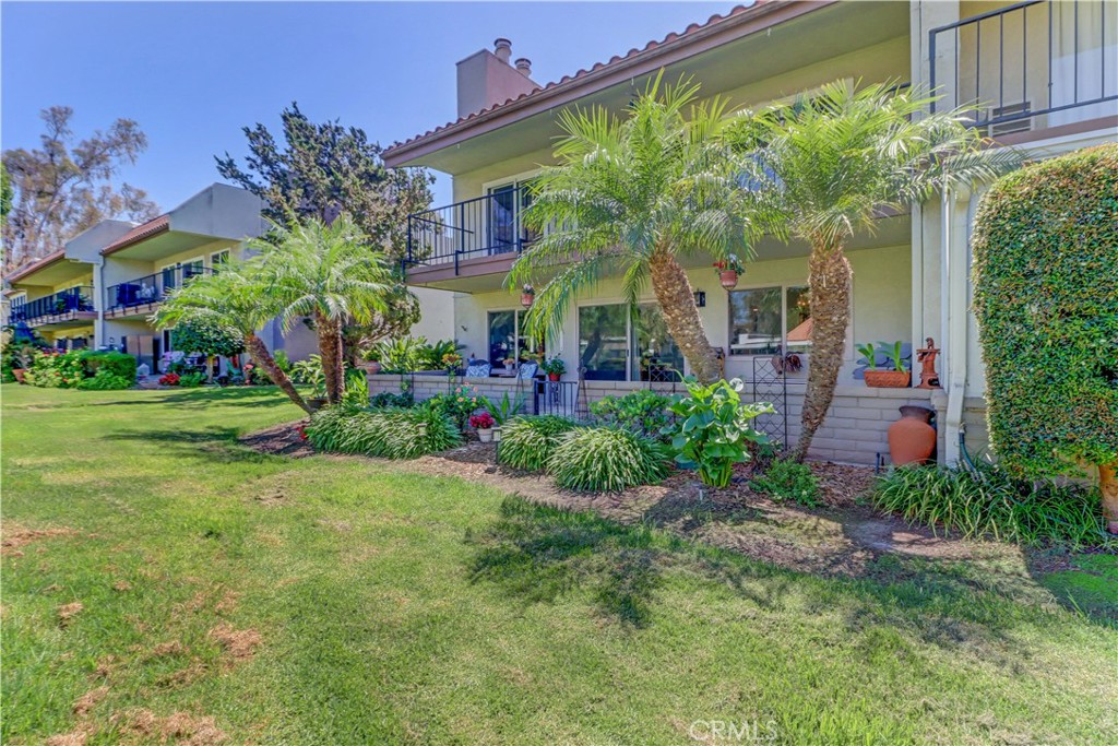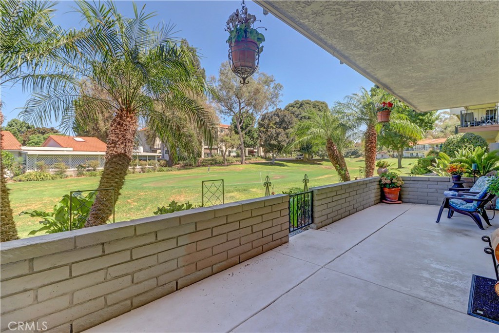 Lower end unit condo located in popular neighborhood facing a manicured putting green with beautiful view down to the serene 9 Hole, 3-Par course fairway. Convenient, easy ramp access (no stairs or elevators), within steps of your private oversized single car garage with built-in storage cabinets. Neutral walls and smooth ceilings throughout (painted in 2024), with newly installed carpet in the bedrooms and tile floors in the remaining interior space. Vertical window blinds and drapes offer privacy, while allowing ample natural light from dual pane windows facing all four compass directions! The open nature of the Casa Milano 2 floorplan (roughly 1218 sqft) allows you to enjoy the garden patio off the dining/living room, with plenty of space for your BBQ, patio furniture and to start your day watching local wildlife. In the summer afternoon there’s frequently a gentle afternoon sea breeze cooling the air. The entire northern wall of the living/dining area looks over lush green trees, grass and landscaping – all visible through large windows and a slider door to the patio. The living room also has a wood burning fireplace. Plenty of room for your table under a new bronze chandelier. The bright kitchen offers easy-care hard surface counters, white cabinetry including a large pantry with roll-out drawers, window over the sink and all new stainless steel GE appliances (installed late 2024). The counter depth refrigerator has French upper doors, a lower freezer drawer, automatic ice maker, and interior access to filtered cold water. The glass top 5-burner range offers both convection and air fryer oven features with the matching built-in microwave. Handsome new full-size Electrolux graphite front load washer and dryer tower (also installed late 2024) is centrally located for easy access between both bed and bathrooms. Bathrooms have been updated from original construction. The guest bath across from the second bedroom has a large walk-in shower with seating, stone countertop, new 19” Kohler toilet, and nickel fixtures. The ensuite master bathroom offers similar finishes, toilet, and fixtures. The floorplan provides wide hallways and plenty of storage throughout the condo. And of course, Laguna Woods Village includes resort-style amenities, as a truly active senior community with multiple golf courses, equestrian center, pools, clubhouses, central restaurant, transportation system for ease of shopping and travel, plenty of activities & so much more!
