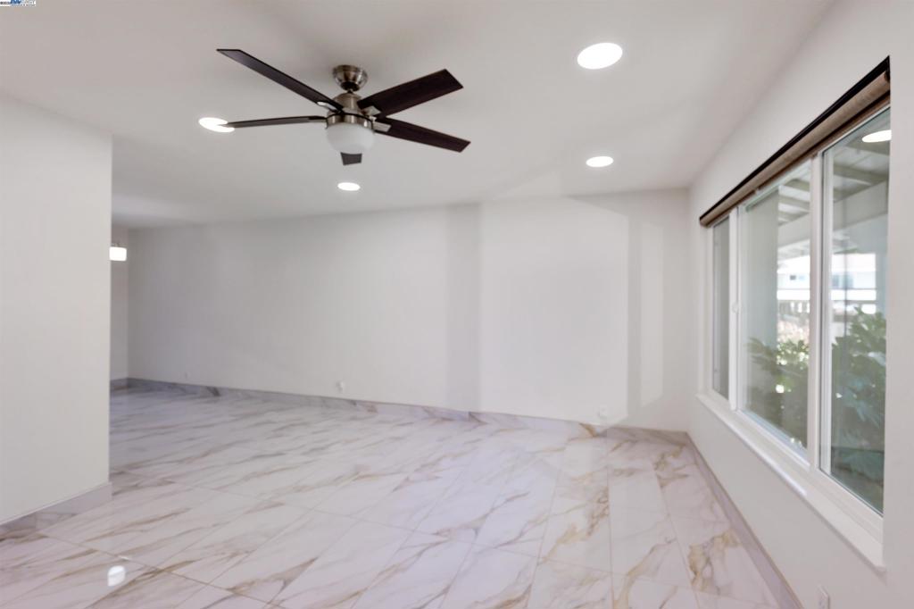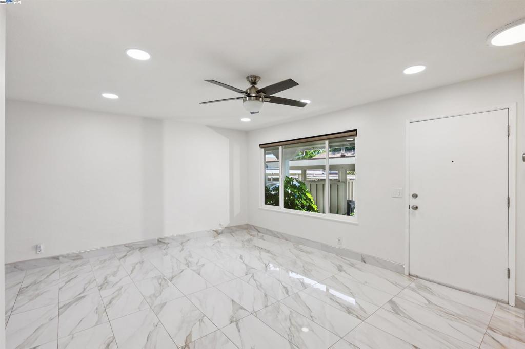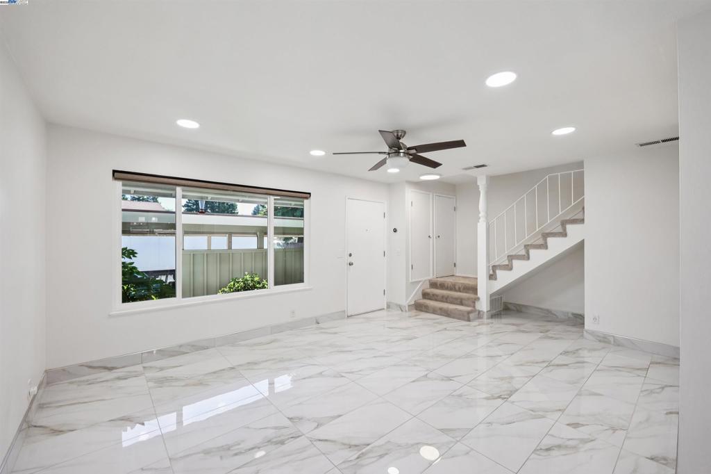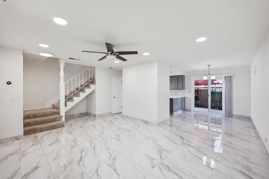 Beautiful NORTHEAST facing townhome tucked at the end of a quiet court in the desirable Twin Creeks neighborhood! Recently updated with beautiful elegant oversized tile flooring & baseboards in the living room/dining room/kitchen. Large spacious light filled living room has been recently updated with new recessed lighting and ceiling fan. Updated modern kitchen with quartz countertops, full tile backsplash, gray cabinetry, and stainless steel appliances, including refrigerator. Dining Room with plenty of space for entertaining opens to the private back patio with mature shade tree and storage. Guest bathroom is located off kitchen and laundry closet in kitchen with washer and dryer included has additional overhead storage cabinets. Spacious primary bedroom upstairs w/mirrored closet doors, new ceiling fan and large window overlooking backyard. Two additional bedrooms with mirrored closet doors and recently added overhead lights. Updated full bathroom with newer vanity, sink, light fixture & mirror. This move-in ready home also features Nest Smart Thermostat, Dual Pane Windows, 1 Assigned Carport Parking Space, Ample Guest Parking and Community HOA Pool. Located close to top-rated San Ramon Schools, parks, shopping, dining, City Center Bishop Ranch & Easy Freeway Access.