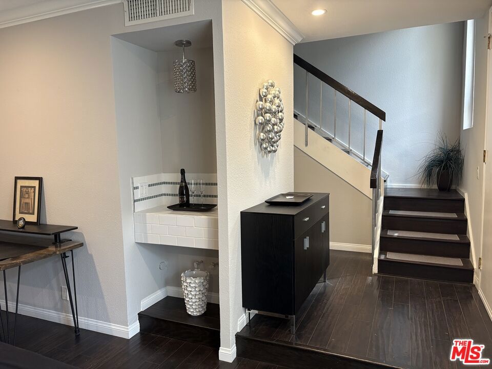 Move-in to this Fantastic 3 Bedroom 2 1/2 Bath End Unit Townhouse in Tarzana Oaks Complex. This Bright and Airy Unit features Engineered Hardwood Floors, New Energy Efficient Recessed Lighting and New Paint throughout, along with Crown Molding and step down Living room with Fireplace. Kitchen has White Cabinets, Quartz Counter-tops and Glass Tiled back splash, Eating area which opens out to your Private Back Yard. Bathrooms updated with White Vanities and Designer Tiles. Larger Bedroom has Cathedral Ceiling, 2 Large Closet and it’s own Private Bath. This Unit is Facing Small Courtyard Walkway with Trees and Flowers, Close to the Gated Community Pool and Private Two Car Garage. Ready for a quick, short escrow with NO Drama. Priced to sell.