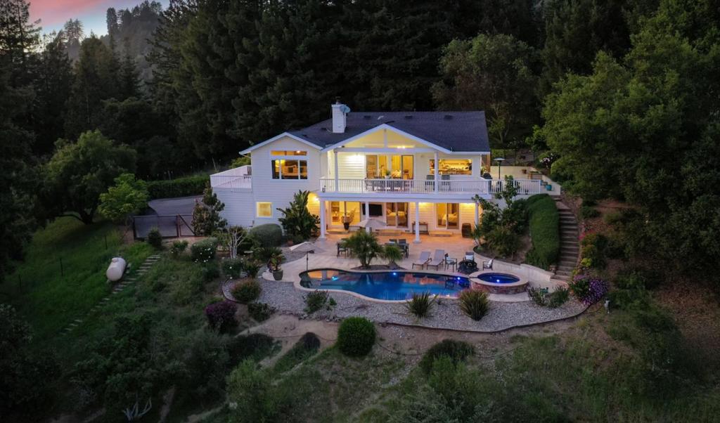 Stunning Ocean View Estate in Gated Corralitos Community! Perched atop a scenic hilltop in a private gated enclave of Corralitos, this spectacular custom-designed home offers breathtaking ocean and valley views on nearly five sprawling acres. Perfect for entertaining, relaxing, or expanding, this one-of-a-kind property combines luxury with tranquility just minutes from town. This spacious residence features 4-bedrooms plus a bonus 5th/office, along with 3-full bathrooms, including a luxurious steam shower in the primary suite. Vaulted ceilings, recessed lighting, and newer flooring create a bright and inviting atmosphere throughout. A custom designed pool/hot tub overlooks sweeping ocean/valley views, while multiple decks provide the perfect setting for entertaining family and friends. The property offers potential for an ADU, and fenced areas are ideal for animals such as dogs, goats, and chickens. Detached bonus shed great for/work-out room/weekend projects. A newer Generac generator, powered by one of 2 separate propane tanks one for the home and one for the pool and generator ensures peace of mind and functionality year-round. Zoned and ready for your dream lifestyle, this exceptional home offers privacy, comfort, and unmatched scenery in a highly sought-after location.