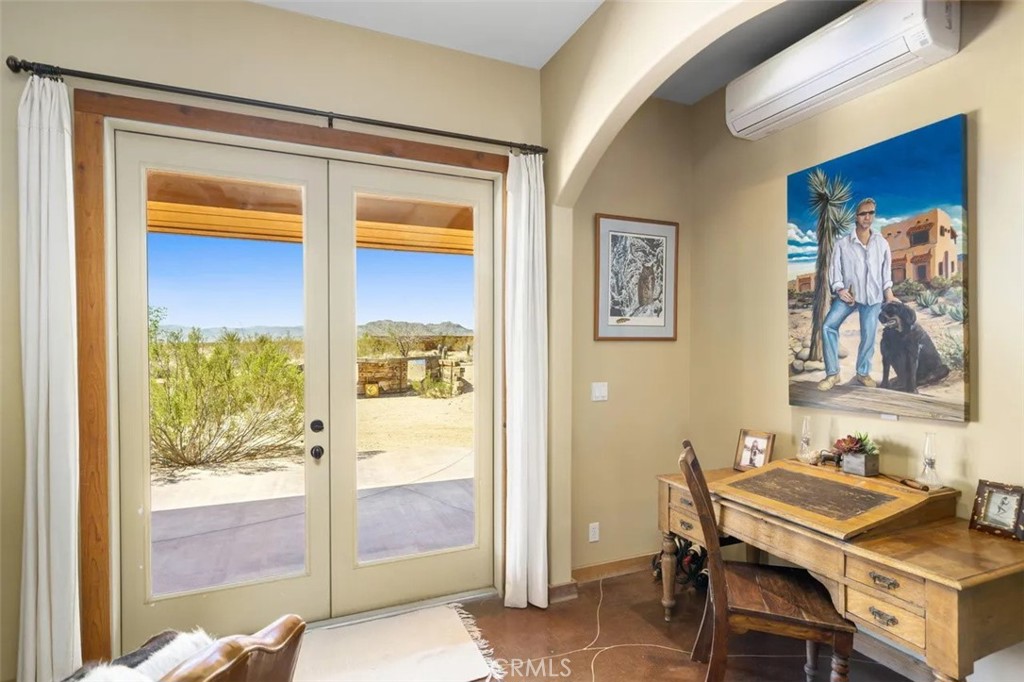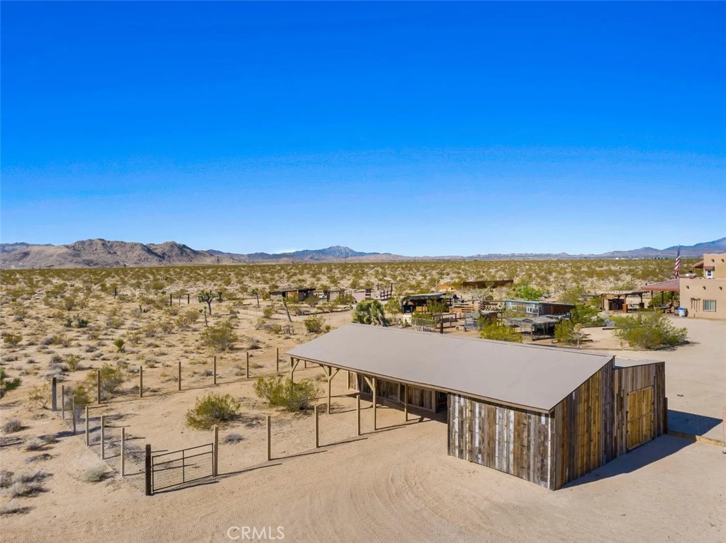 Tranquility & privacy awaits! This newly upgraded three bedroom, three bath home is located on 15 acres right in the heart of Joshua Tree. Throughout the home you’ll enjoy the simple yet thoughtful touches that slowly transform your busy thoughts into a relaxed, meditative state. Conveniently located 20 minutes from Joshua Tree National Park, 13 miles from black rock nature center & 8 miles from local grocery stores. Unobstructed poolside views of Joshua Tree National Park perched on the southern horizon. Newly constructed Pebble Tec pool blends seamlessly with the landscape. This 15-acre ranch, located 20 minutes from Joshua Tree National Park and 13 miles from Black Rock Nature Center, perfectly merges luxury with the raw essence of the desert. Relax in the 50-foot pool or enjoy a tranquil evening in the 10-person spa. Pride of place is the outdoor patio, adorned with awe-inspiring artwork crafted by Master Artist Troy Bryant and 100 other local talents, ingeniously piecing together portraits of the very animals who once roamed this ranch. This outdoor space also features a barbecue area complete with ample seating, ideal for those who love to host. Nestled in its harmonious environment, you won’t find a neighbor for at least 3/4 of a mile in any direction. Bask in the serene privacy of this secluded gem where you can lay under the stars unclothed if you so choose, with not a soul in sight. This desert gem sleeps 13, offers a 3 bedroom, 3 bath cheerful, sun-bathed living space fully furnished with a 3-car garage and includes multiple outdoor sheds and 2 Conex boxes for all of your storage needs. 20kWh of solar and 2 Tesla batteries provide peace of mind by eliminating the electric bill and giving seamless protection in the event of any power outages. There are 2 industrial swamp coolers designed to cool the house and mini splits in each room to bring each area to your desired comfort level. The roof deck allows for nearly 360° views of Joshua Tree taking sunrises and sunsets to a whole new level. The 5-acre lot that adjoins the house lot has a little dirt racetrack for UTVs, dirt bikes, or ATVs, and even a 5-acre lot to the south with a paid water meter on it. The grounds are intricately lined with railroad ties from the very tracks that helped pave the West. The existing infrastructure, including water spigots at each animal pen and intact fencing, allows the new owner to easily revive the bustling ranching operation if desired.