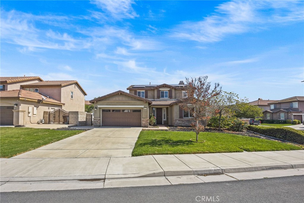 Welcome to to this beautifully upgraded corner-lot home with LOW HOA and FULLY PAID SOLAR! Located in one of Eastvale’s most desirable neighborhoods — part of the highly rated Corona-Norco Unified School District! Step inside to a bright, open-concept layout with high ceilings and a spacious living and dining area that flows into a modern kitchen with granite counters, stainless steel appliances, an amazing walk-in pantry, and a large island perfect for family gatherings. Upstairs, enjoy a versatile loft with built-in office space, ideal for remote work or a study area, plus well-sized bedrooms and a serene primary suite with dual vanities, soaking tub, and large walk-in closet. The main ground level includes a full bedroom and bath, perfect for guests or multi-generational living. Step outside to your private backyard retreat featuring a covered patio, storage shed, and mature fruit-bearing trees — Orange, Grapefruit, Cherimoya, Calamansi lime, and Pear — offering both shade and fresh harvests year-round. This home also boasts a 3-car garage, a whole-house water softener system, and 16 Solar Panels for energy efficiency and peace of mind. Located in a quiet, well-kept community close to parks, shopping centers, and top-rated schools, with easy access to the 15, 60, and 91 freeways — and just a short drive to Ontario International Airport — this home truly offers the best of Eastvale living.