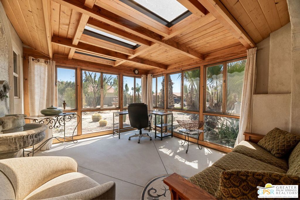 Income opportunity. Live in one and rent out the other! Shangri-La in the desert! Deluxe 3-bedroom, 2-bath home plus separate ADU with kitchen, upstairs loft and bathroom! Upon entry of the main home, enjoy a private enclosed sunroom. The eat-in kitchen features expansive white quartz countertops, stainless steel appliances, and a large walk-in pantry. Kitchen opens to a spacious living room which includes a fireplace for cozy moments, large sectional couch and shuffle board. Updated bathrooms, and tiled flooring throughout. The primary bedroom has a separate mini-split system and the home includes energy efficient, owned solar panels. The large 2-car garage includes a laundry area. Relax in the landscaped backyard oasis with mountain views, a pool with tanning shelf, and spa. Motorized screens shade the enclosed backyard patio area with TV that overlooks the pool, with a hidden drain for easy rinsing. House is being sold furnished as shown. Two-story casita has floor-to-ceiling windows overlooking the pool and spa, with heavy wood beams and tongue-and-groove ceilings. It includes a full kitchen with black granite countertops, a bathroom, loft and 10′ closet complete with shelving. Casita has separate heating, A/C, and water heater to provide privacy and comfort. Sale Includes separate landscaped lot next door for a total of 16,552 sq. feet of fee land.