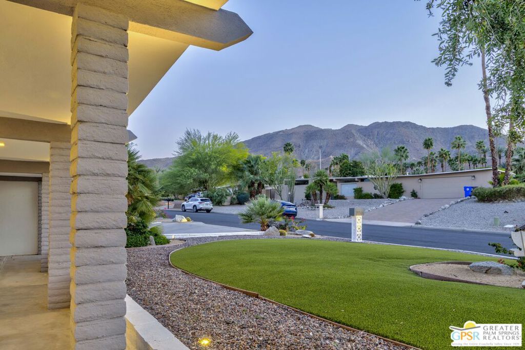 This beautifully reimagined mid-century residence in prestigious Magnesia Falls Cove captures the essence of classic desert modernism, stunning mountain views with the ultimate resort-like setting! Inside, light-filled spaces and an open-concept floor plan create effortless flow for both everyday living and entertaining, seamlessly connecting to the outdoor retreat. Main house includes 4 bedrooms- 2 en suites with access to backyard, 3 updated bathrooms, polished concrete floors throughout, and updated kitchen. Relax and unwind in the mid-century estate on an oversized lot. Take a dip in the sparkling pebble tech pool or spa while enjoying the magnificent surrounding views or practice your golf game on the 70 ft putting green. Marvel at the exquisite sunsets alongside the firepit, or while dining al fresco. A detached casita provides flexible space ideal for guests, a private office, or studio with a fully equipped kitchenette, king sized bed, living area and bathroom. This home is equipped with 10.22 KW solar system for low cost, eco-friendly living! Furnishings are offered per inventory, creating a seamless turnkey desert retreat that allows buyers to move in and immediately enjoy the lifestyle this estate provides. Just minutes from the shopping and dining of The River or El Paseo Shopping District, as well as world-class golf or hiking, this exceptional property offers a rare opportunity to own a true desert retreat where style, privacy, and location meet!