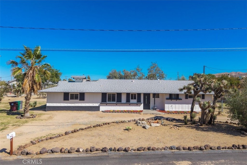 This fully remodeled three bedroom two bathroom home blends modern comfort with desert charm on nearly half an acre, offering both privacy and convenience—just minutes from shopping, dining, and all the amenities of central Yucca Valley. The home is listed as a two-bedroom, two-bath on tax records but shows as a three-bedroom, two-bath with a flexible layout that fits many needs. Inside, the remodel shines with updated finishes, bright and welcoming spaces, and a seamless flow between living areas. The exterior is just as inviting, featuring two separate driveways: a circular drive in the front for easy guest access and a side drive that connects to the cul-de-sac—perfect for RV or extra parking. The backyard has a smaller fenced area ideal for pets and children, while the rest of the property remains wide open for future possibilities such as gardens, outdoor entertaining, or additional improvements. This property offers the rare combination of a move-in ready remodel, a spacious lot, and a desirable Yucca Valley location—an ideal desert retreat.